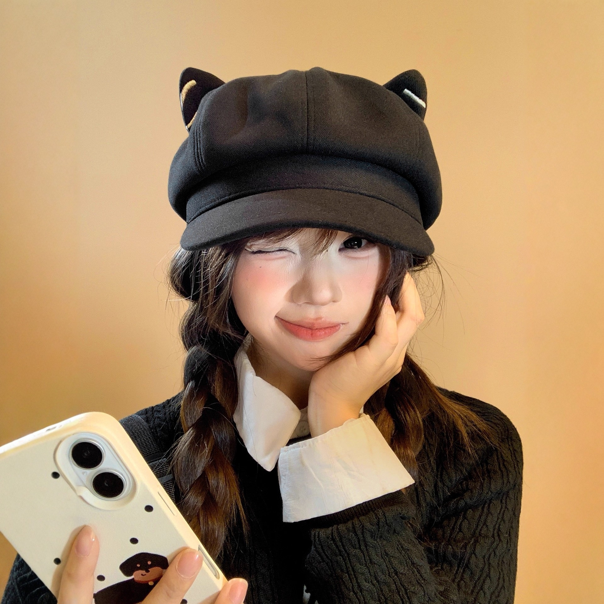 日系可爱毛呢猫耳朵贝雷帽女春秋百搭显脸小鸭舌报童帽八角帽子潮