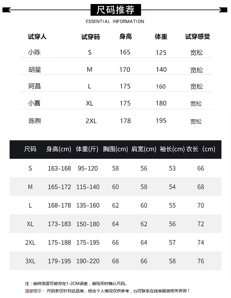 尺码 S【建议95-120斤】,M【建议115-140斤】,L【建议135-160斤】,XL【建议150-180斤】,2XL【建议175-195斤】,3XL【建议190-220斤】
