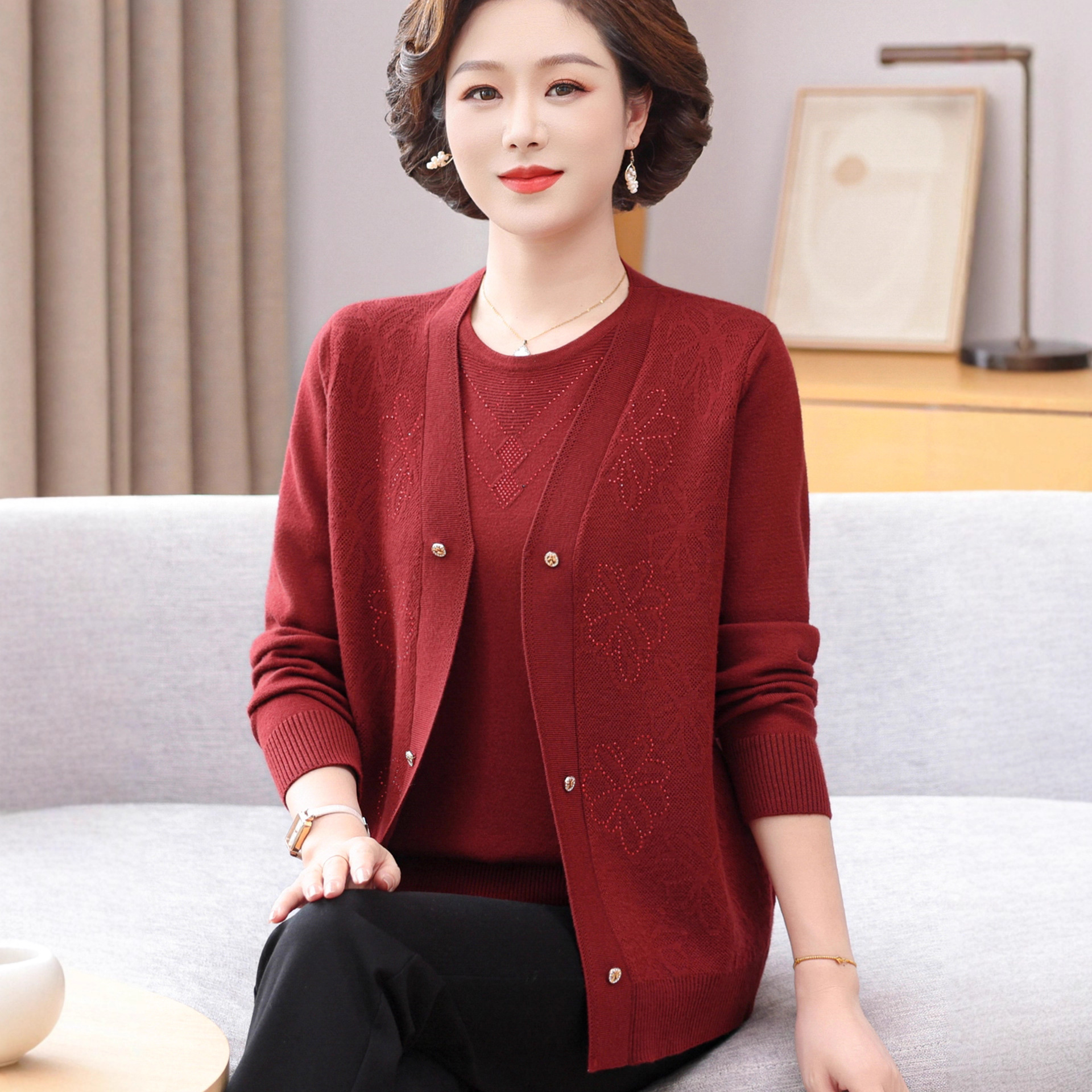 中老年女春秋季针织妈妈套装中年气质显瘦开衫外套减龄T恤两件套