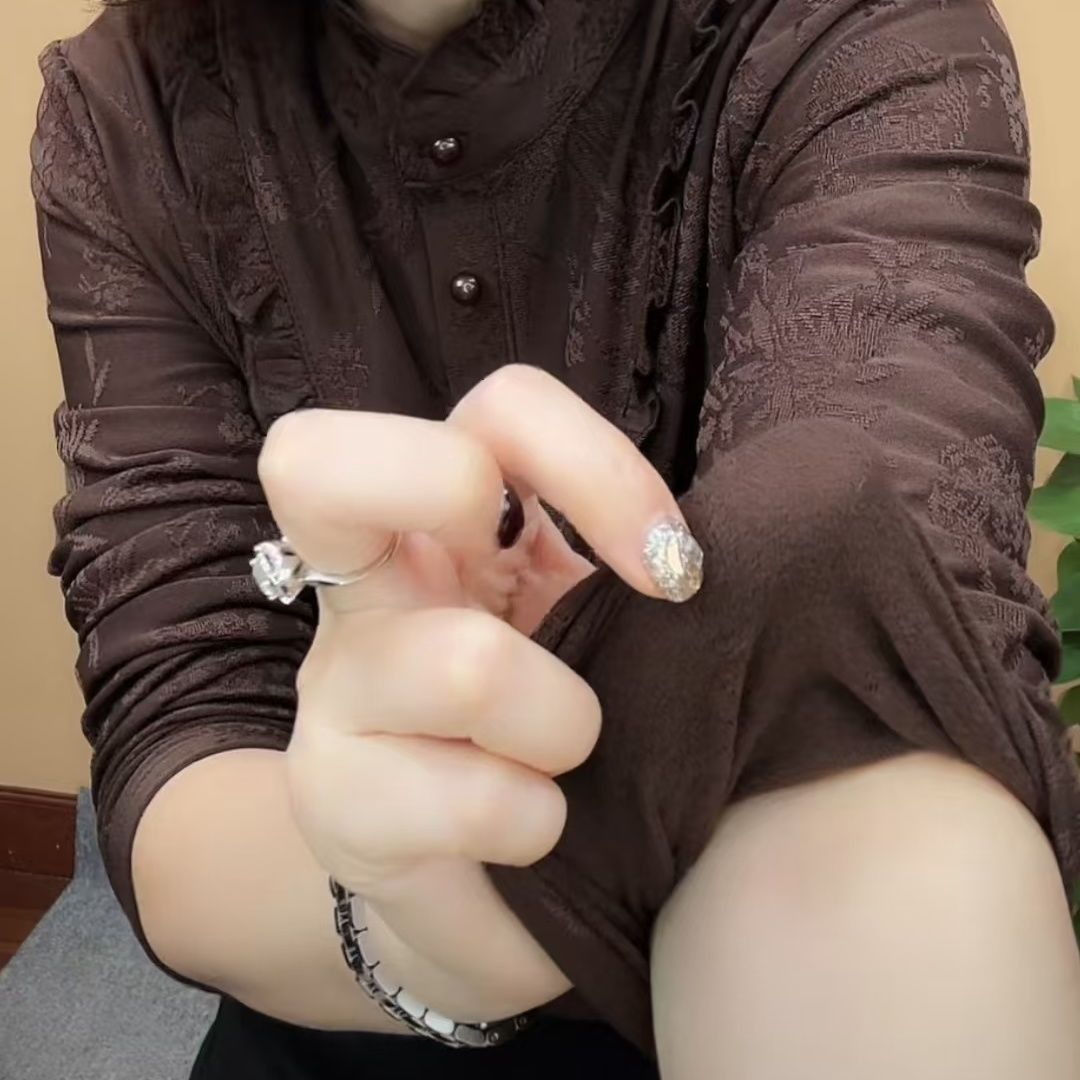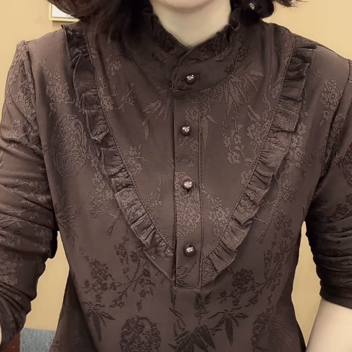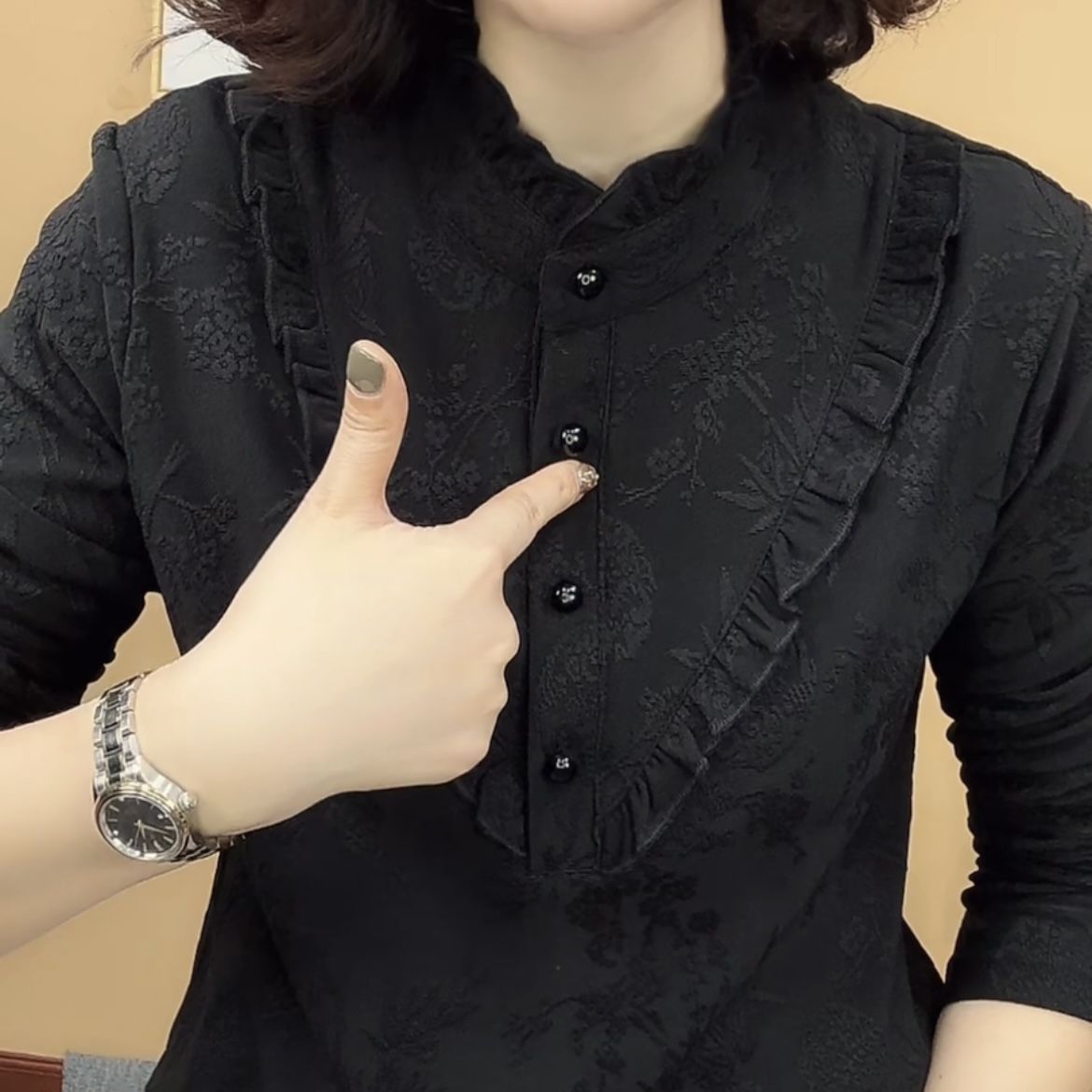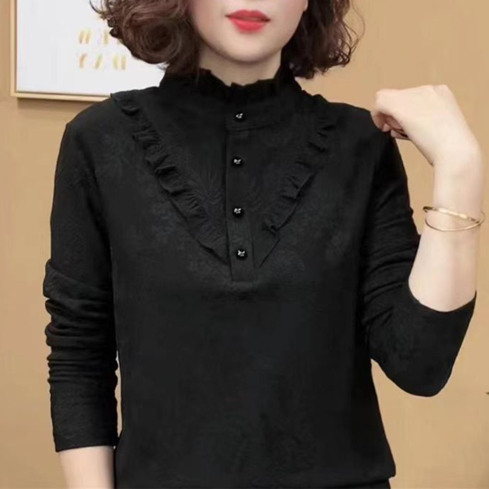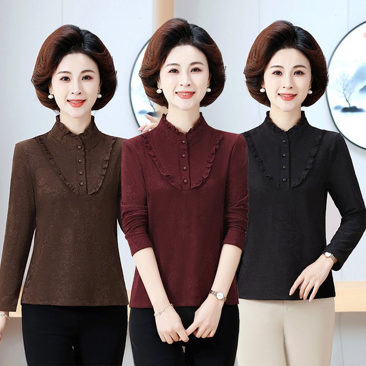 新款秋冬时尚半高领长袖纽扣设计荷叶领保暖衫遮肚中老年妈妈上衣