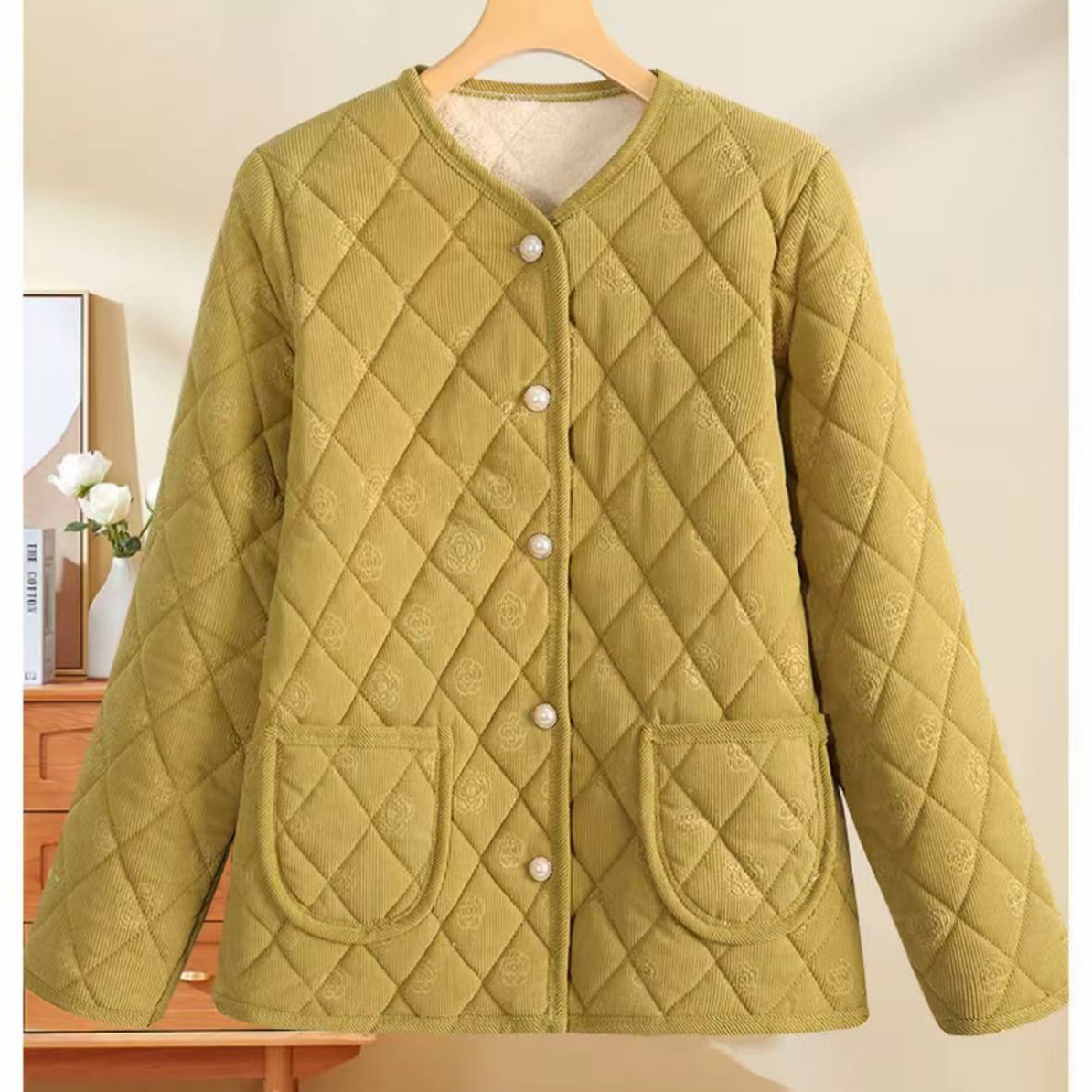 新款中老年秋冬灯芯绒加绒棉袄妈妈宽松保暖外套棉衣绿色橘色粉色