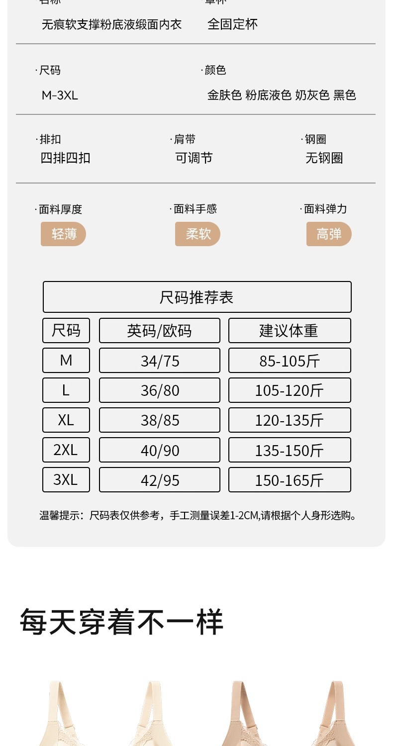 尺码 M码=34/75ABC通杯,L码=36/80ABC通杯,XL码=38/85ABC通杯,2XL码=40/90ABC通杯