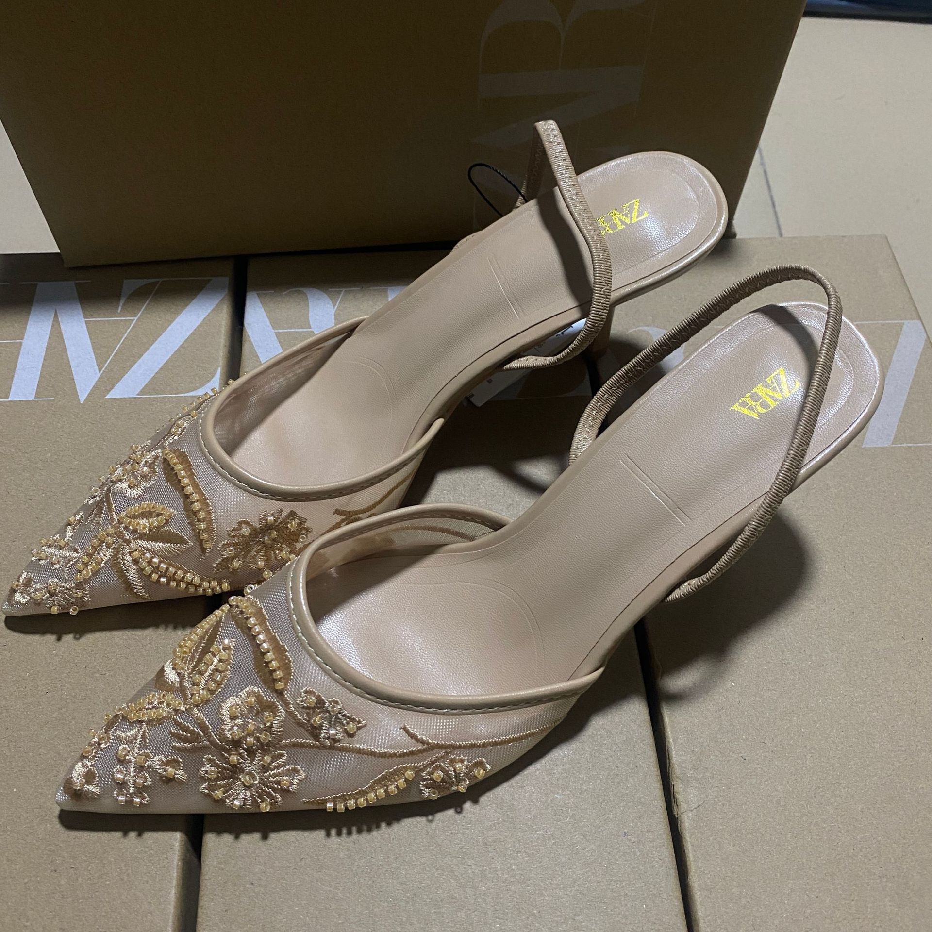 Za 2025春の新作女性靴杏色ビーズ飾り網面露と先の細いハイヒールのミュラー靴