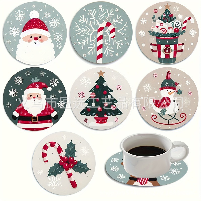 6件套迷人的圣诞风格木制杯垫圆形耐热防滑饮料垫家居和派对装饰