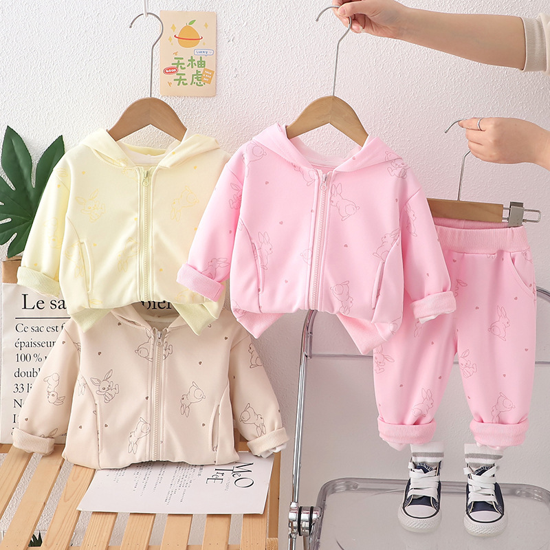 女の子カジュアル2025セットのピンクのウサギのプリントの洋気の衛衣のズボンの2セットの新型の春服