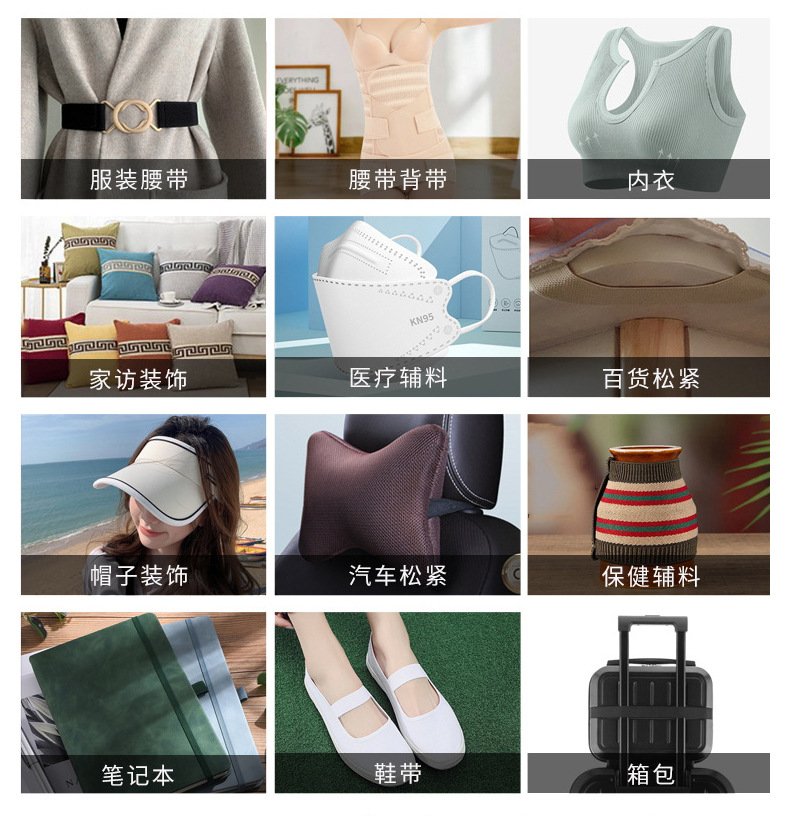 适用范围 眼罩,护具,内衣,帽子,头灯,健身器,浴帽,束发带,口罩,服装,家纺,鞋套,服饰,发绳,防护服,蹦床,医疗用品,吊牌绳,运动用品,鞋业,活动礼品,产业用,口罩松紧带,发带头绳,户外帐篷类,其他