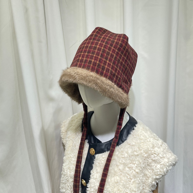 双面戴毛绒系带渔夫帽女秋冬复古格纹盆帽加厚保暖户外防寒护耳帽
