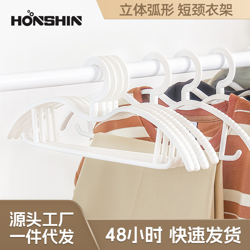 短いネックハンガー、首を縮めるので省スペース、家庭用ワードローブに最適、跡が残らない、肩の角が滑らない、短い服を掛けるための滑り止めハンガー