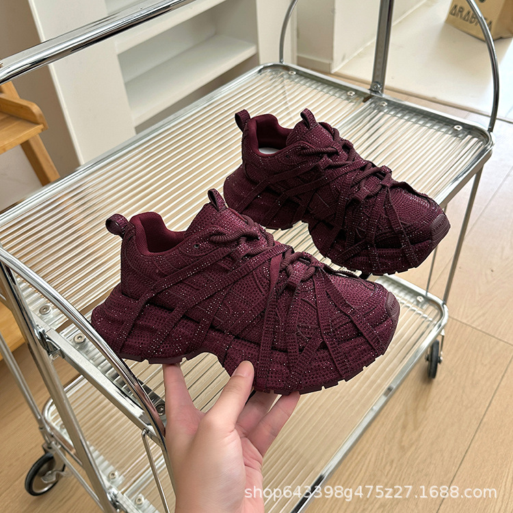 2025新款巴黎满天星水钻厚底老爹鞋女绑带款安可拉红新款休闲鞋子
