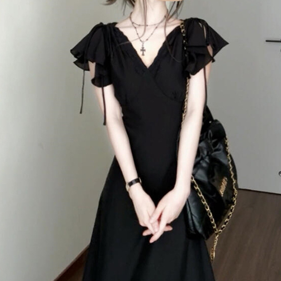 2025 新しいスタイルのウエスト痩身ロングスカートフレンチヘップバーンスタイルブラック V ネックドレス女性の夏