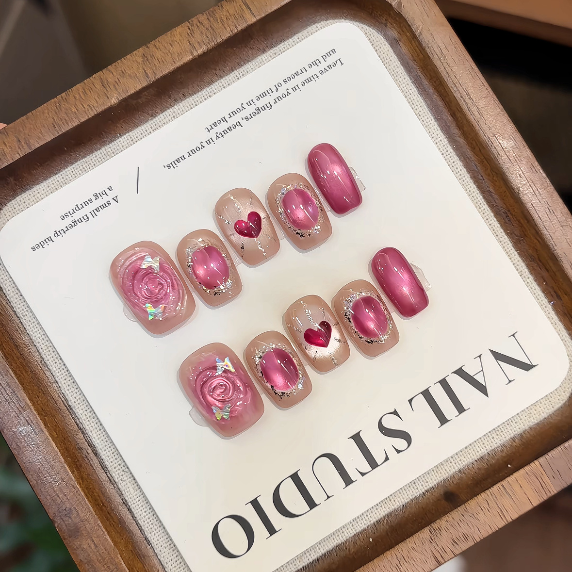 纯手工【冰封蝴蝶】玫瑰色冰透高级心形猫眼闪亮少女心梦幻穿戴甲
