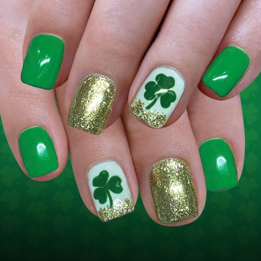 短款亮面方甲欧美圣帕特里克新款浅绿色四叶草金色闪粉穿戴甲24片
