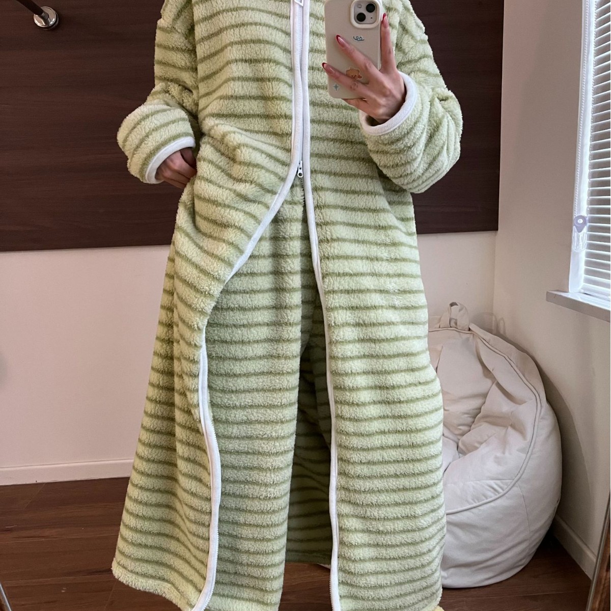 【实拍】鸿楠行走的被窝绿条纹毛绒拉链睡衣厚保暖家居服睡袍连帽