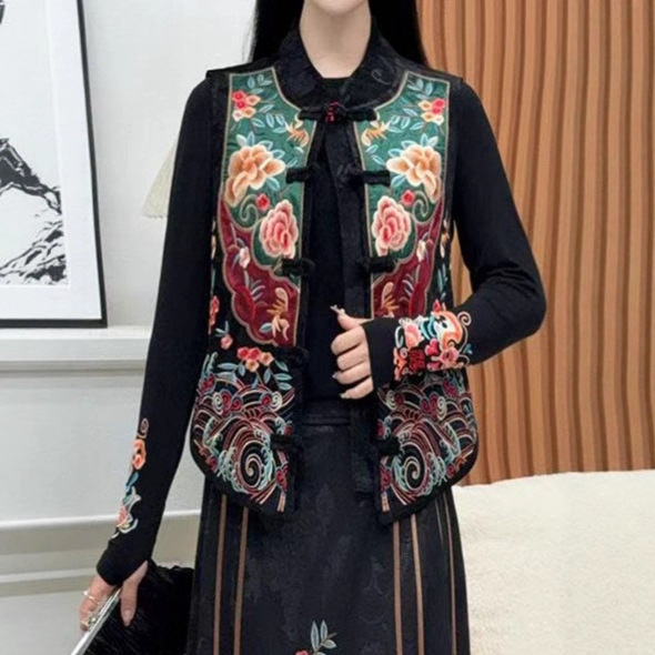 2025秋冬新款国风重工绣花短马甲复古盘扣背心立领民族风坎肩