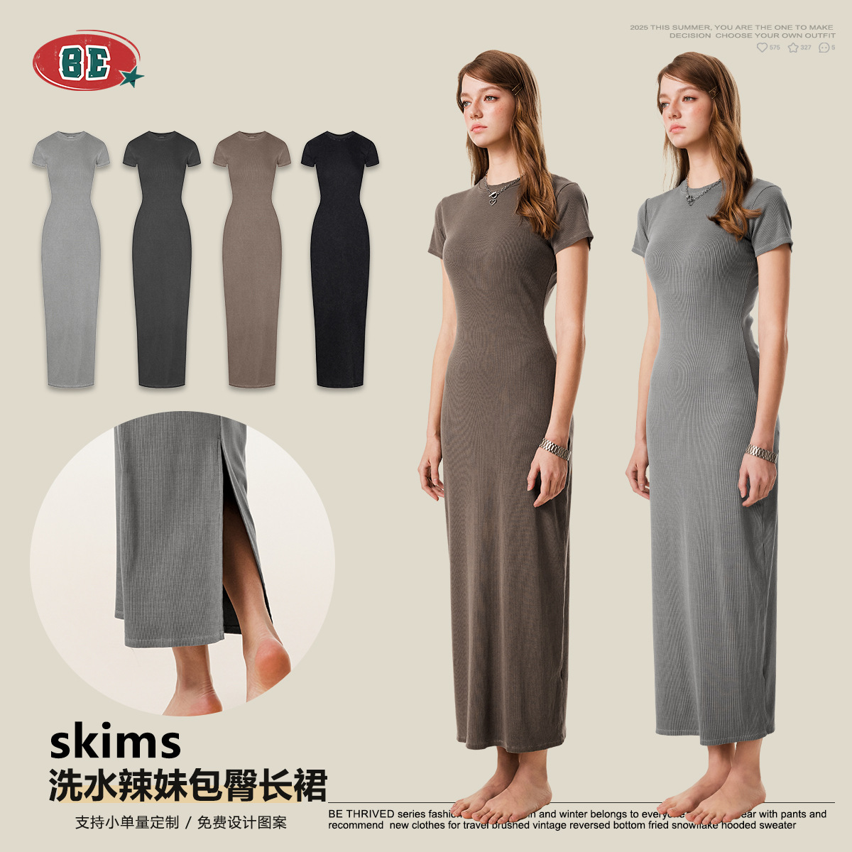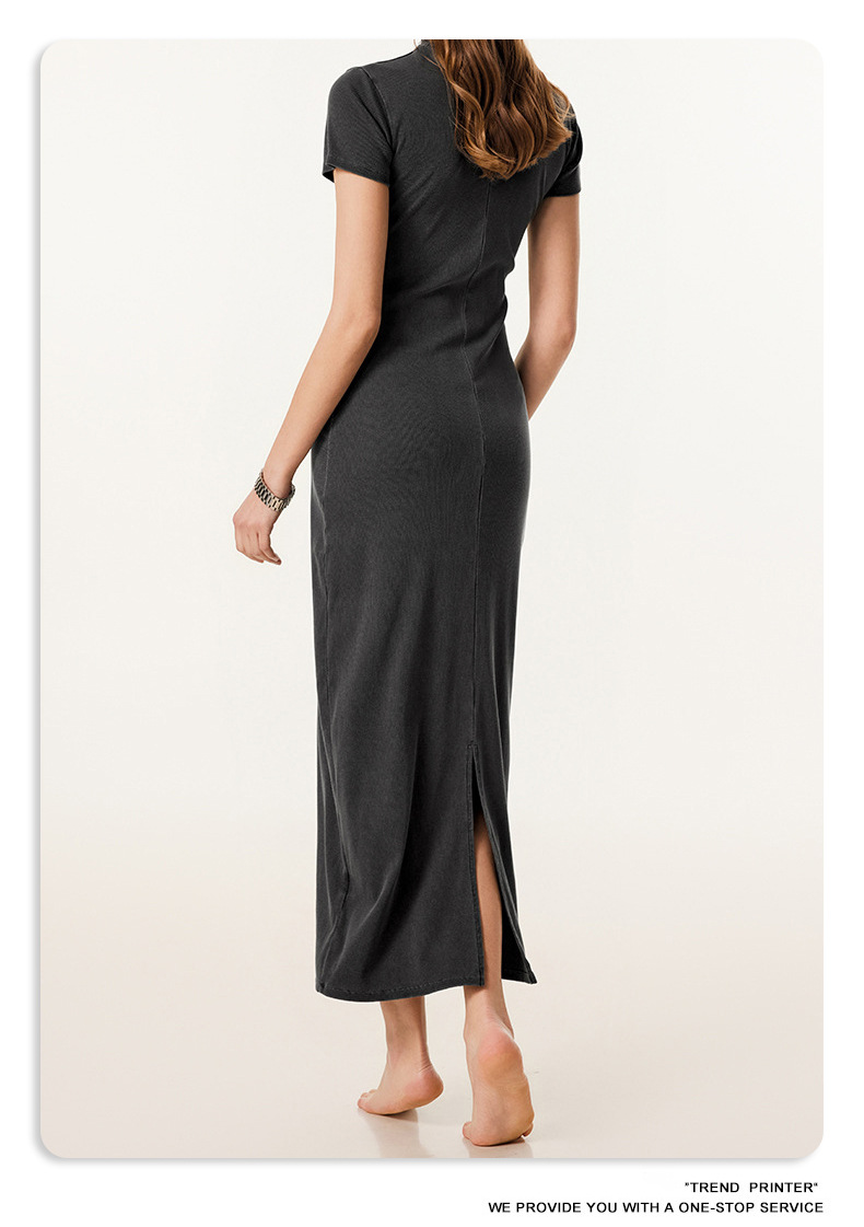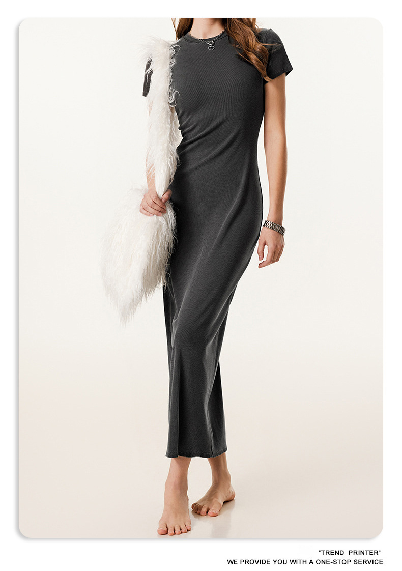 BEレディース2025夏 欧米風ウォッシュ加工ヴィンテージ風半袖ロングスカート スリムフィット ヒップスカート 着痩せ効果のあるスリット入りワンピース