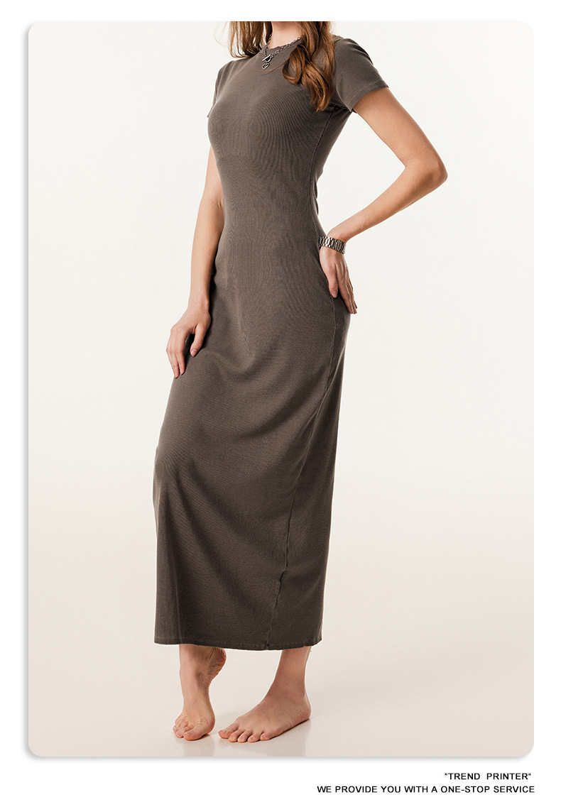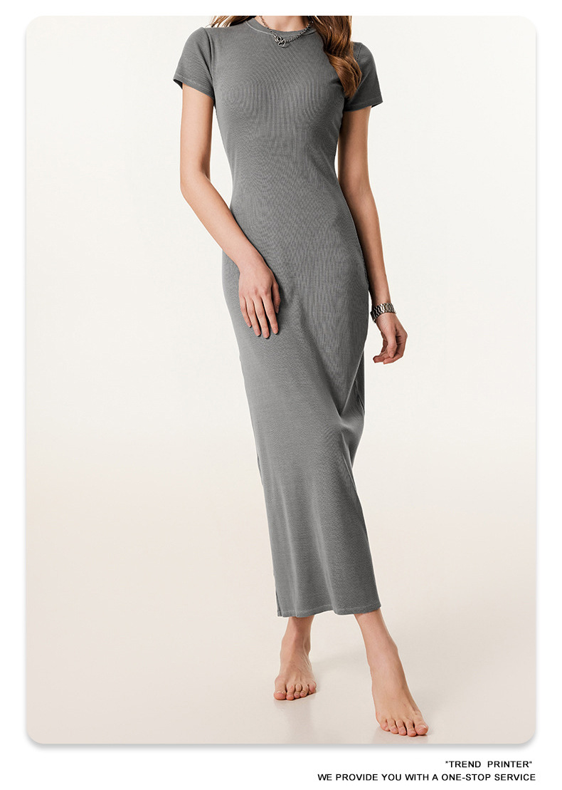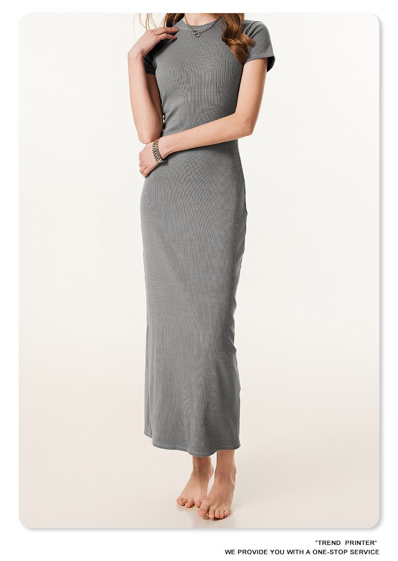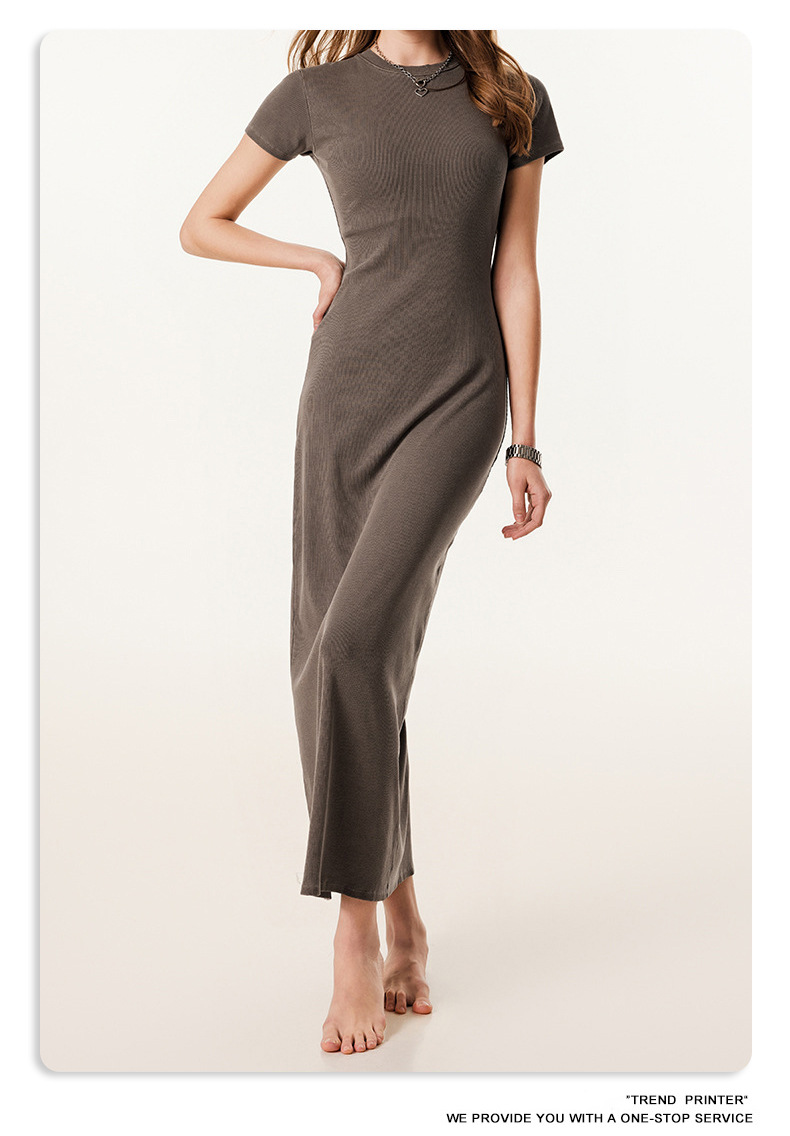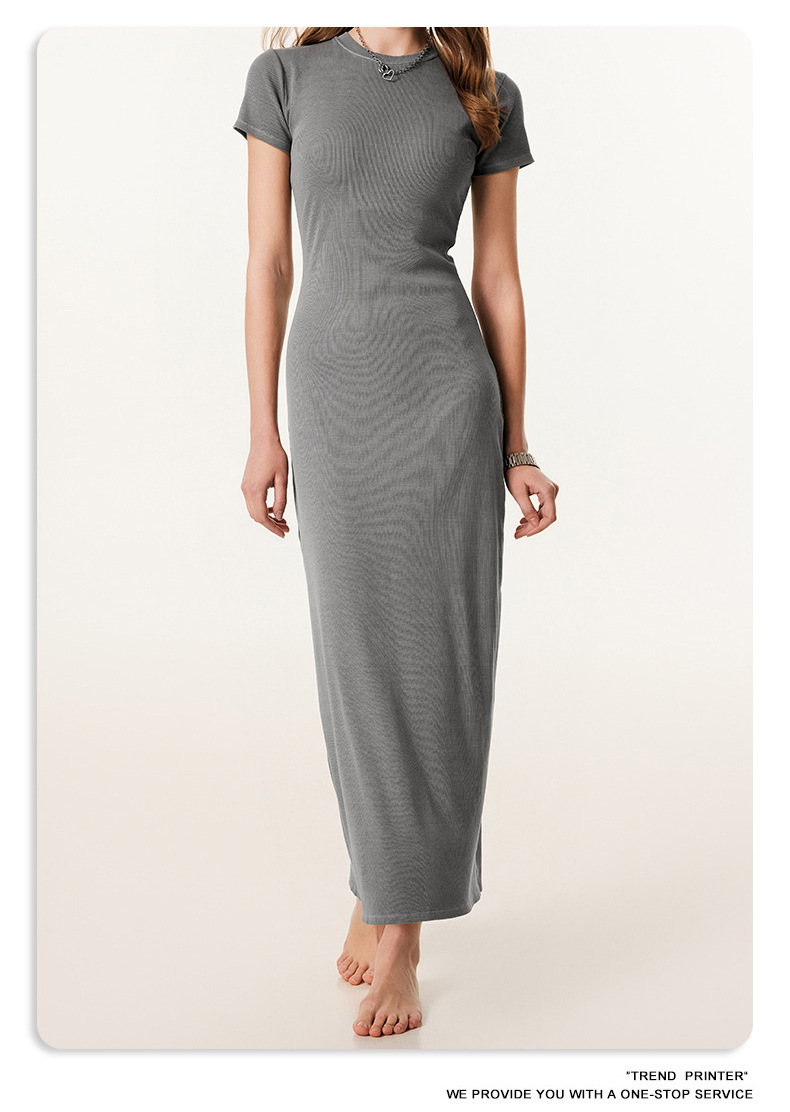 2025冬欧美长款修身显瘦长裙针织短袖连衣裙简约叉螺纹包臀裙女装