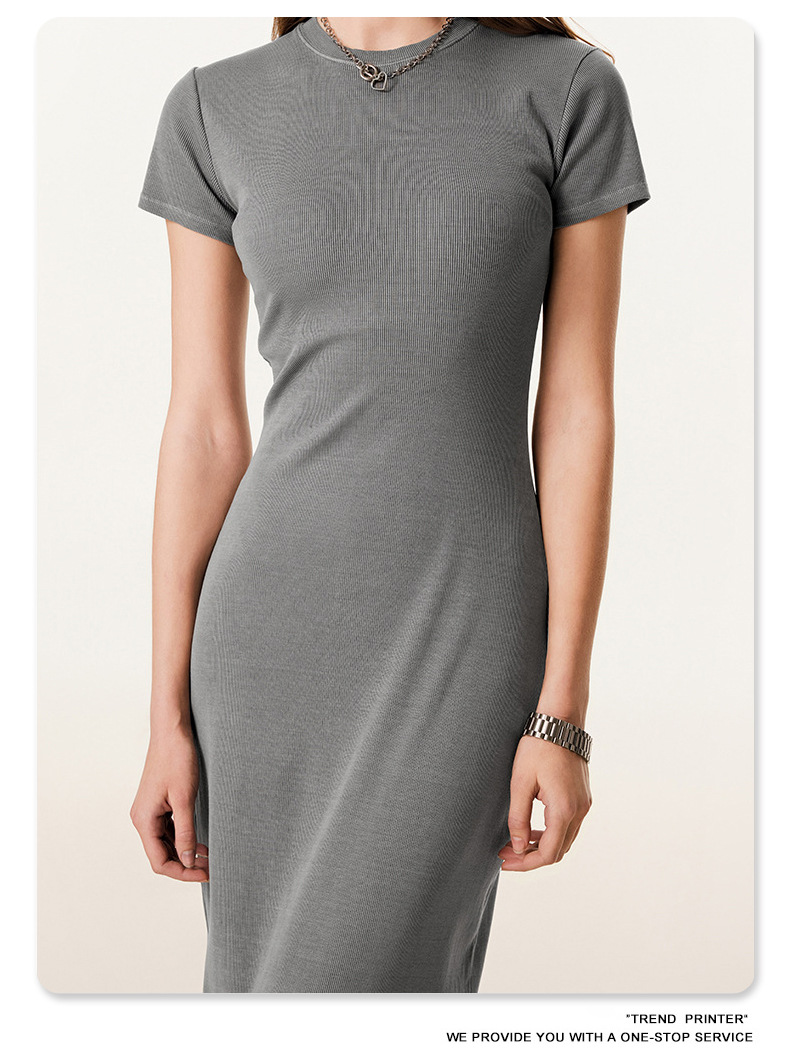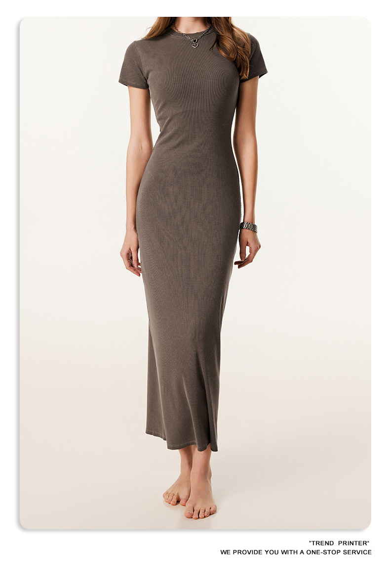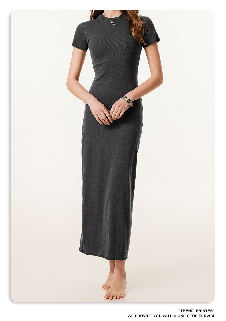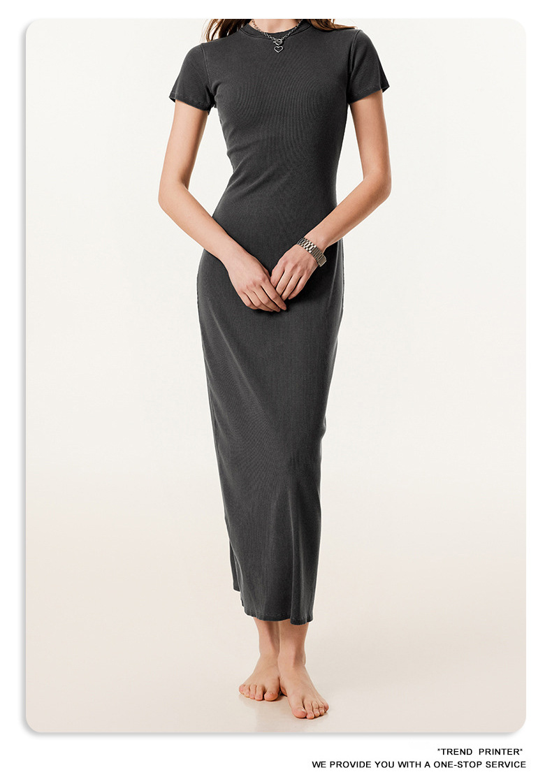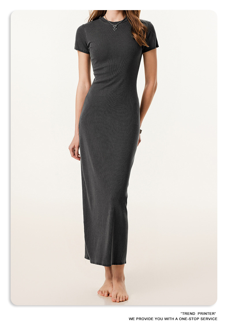 2025冬欧美长款修身显瘦长裙针织短袖连衣裙简约叉螺纹包臀裙女装