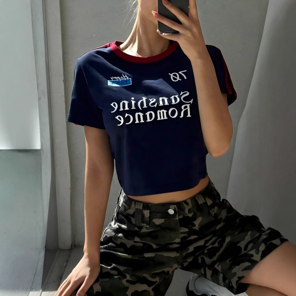 ヨーロッパとアメリカのtemu Xiyin人気の2025夏の女性のTシャツ夏のラウンドネックレタープリントホットガールトップ女性用