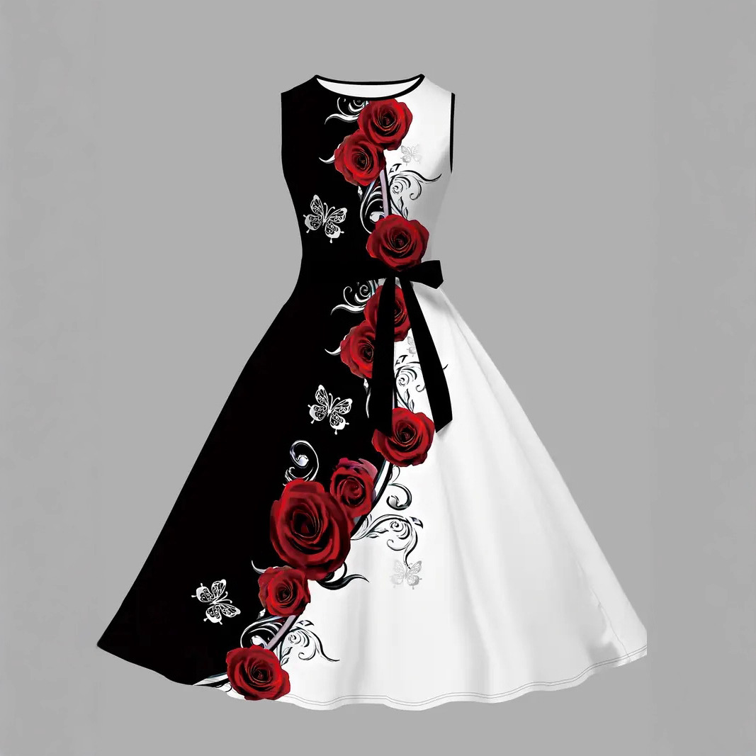 跨境欧美外贸批发3D数码印花鲜艳花朵都市气质优雅女士收腰连衣裙