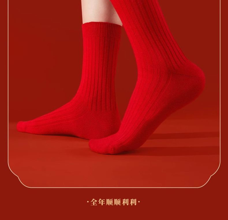 红袜子本命年男女秋冬款新年大红色中筒袜棉袜防臭结婚情侣袜红色
