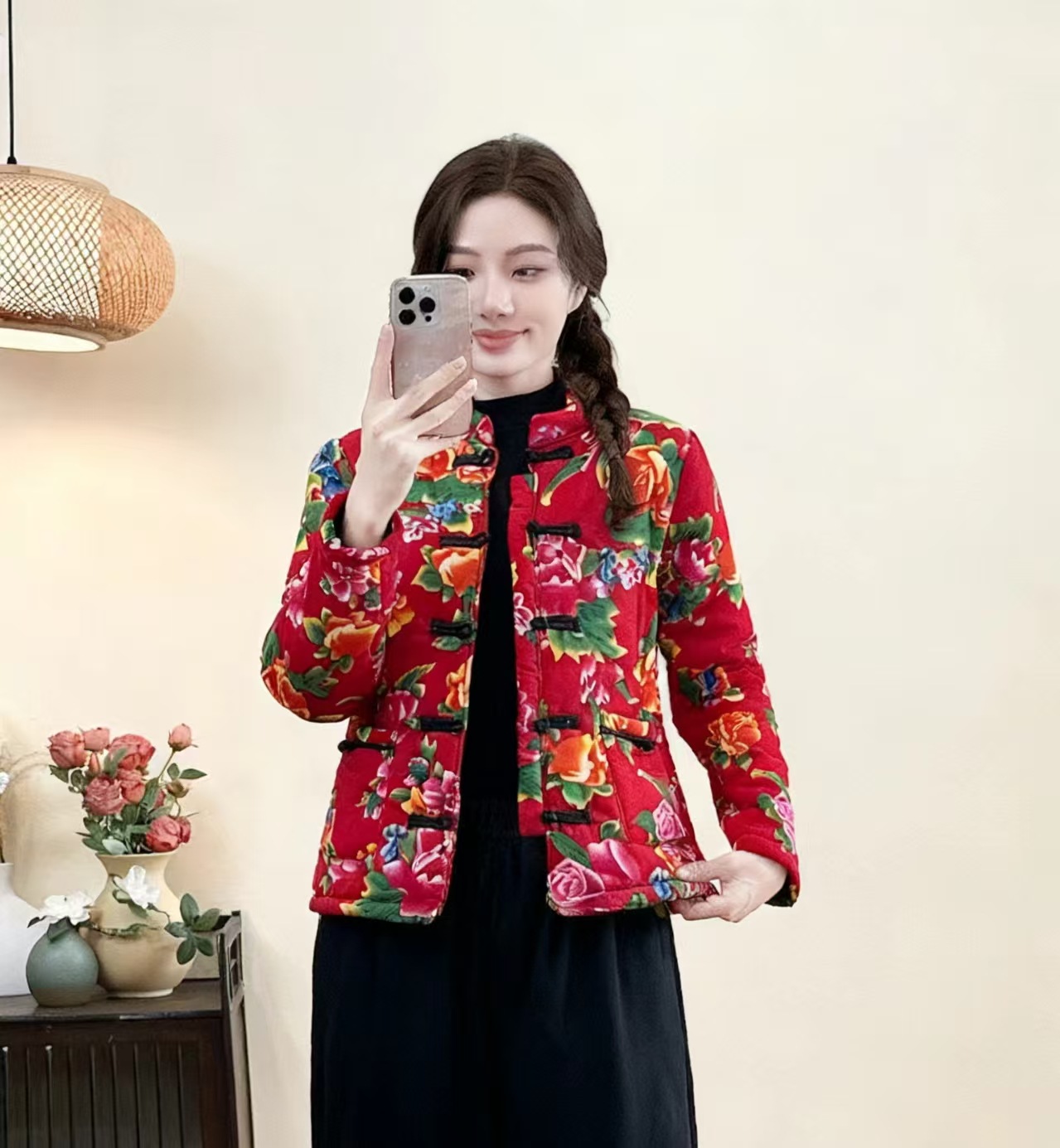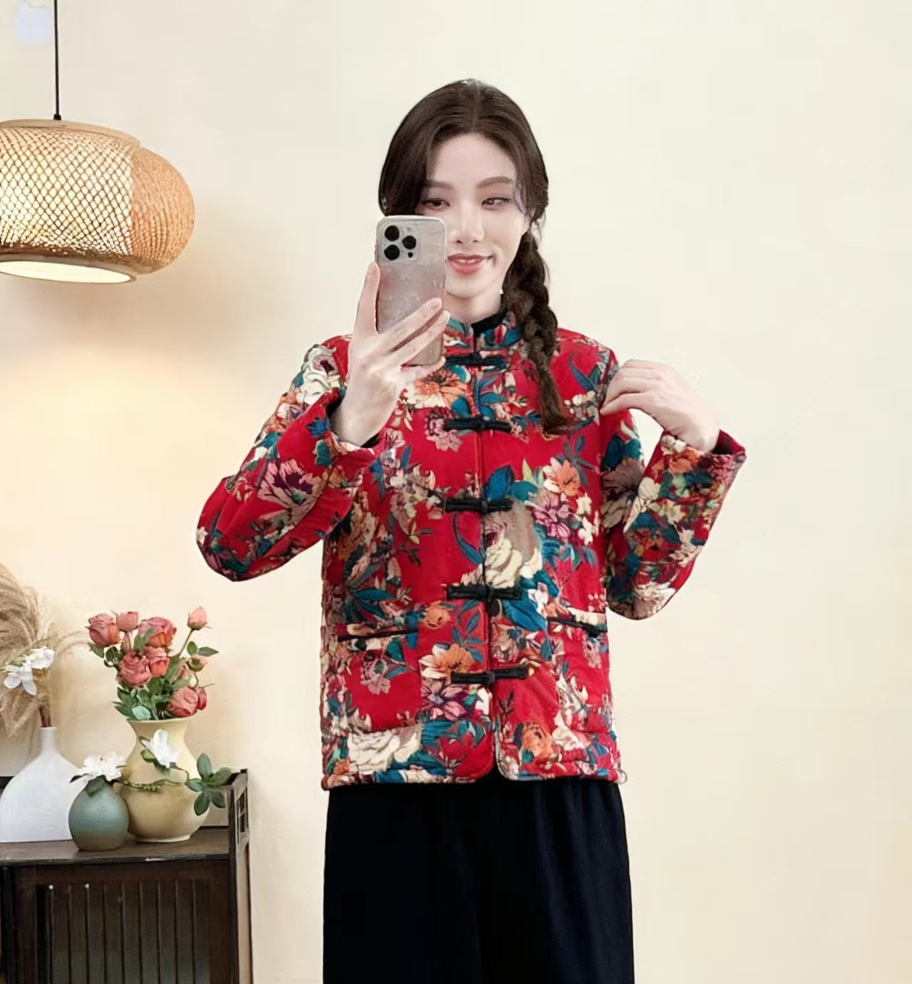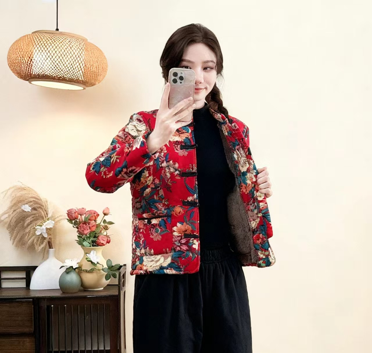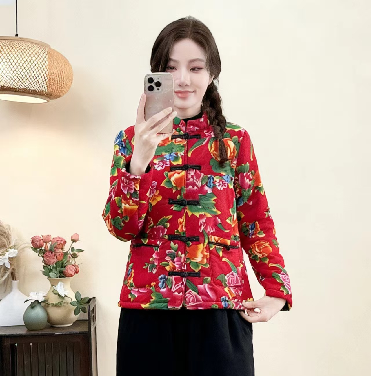 批发东北花棉袄冬季新款中式国风加厚加绒棉服盘扣棉袄立领保暖
