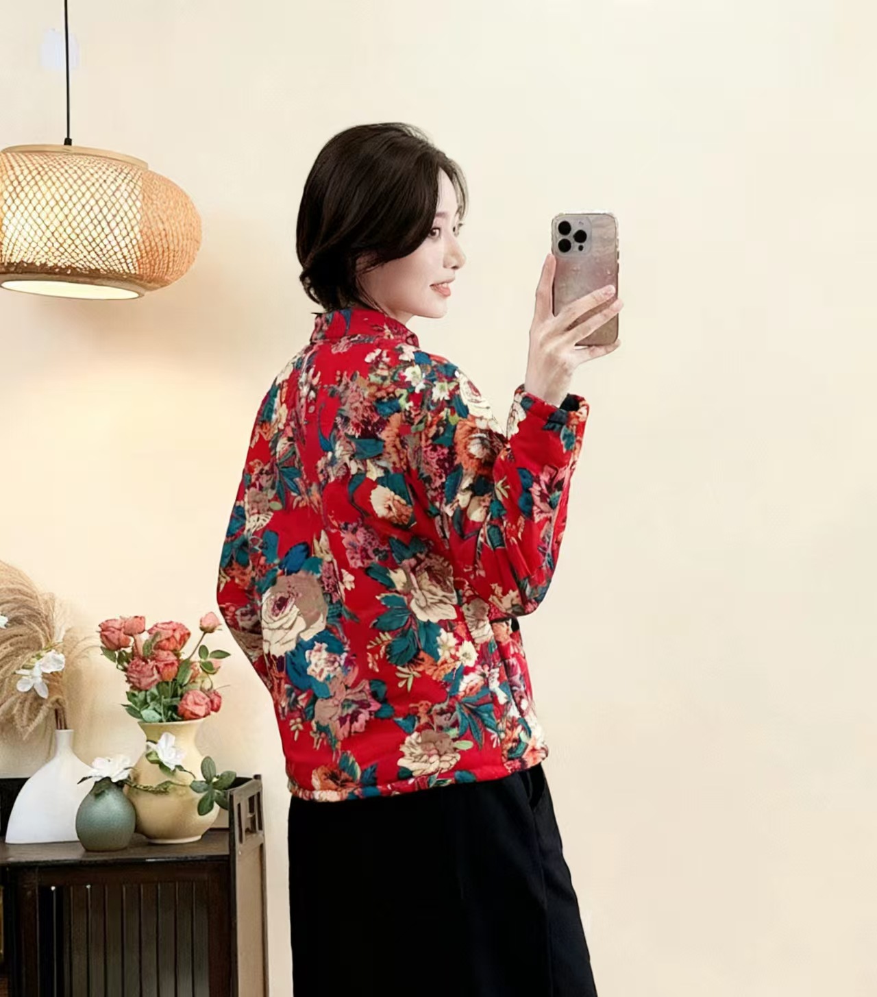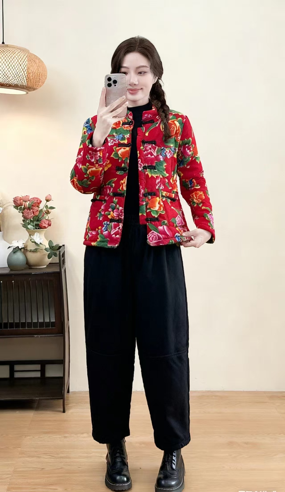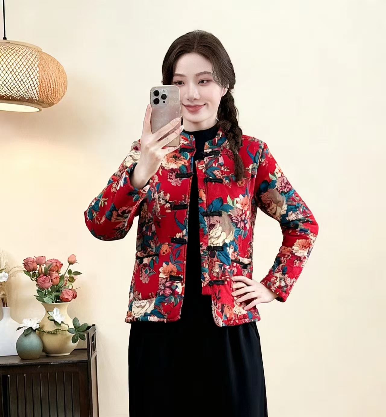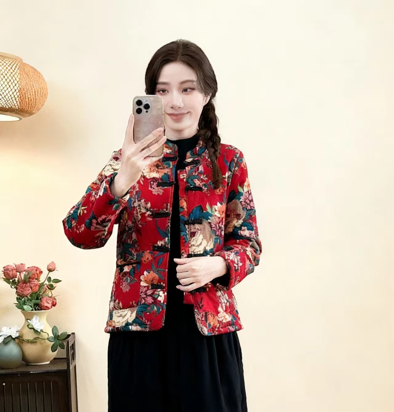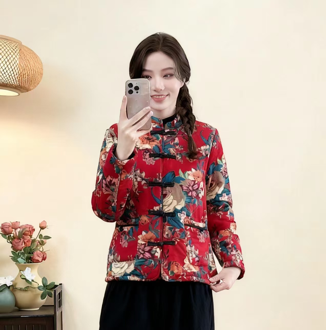 批发东北花棉袄冬季新款中式国风加厚加绒棉服盘扣棉袄立领保暖