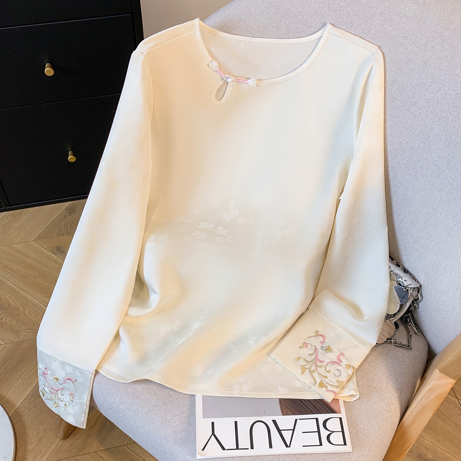 刺繍の上着の長袖のtシャツの新型の2025盤は中国式の国風の気質の復古の民族の風の上着の底のシャツを掛けます。
