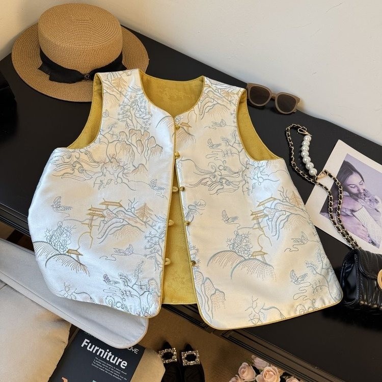 ドロップシッピング 2025 新しい両面ダブルウェアレトロ中国風ベスト重工業刺繍中国風チョッキ扇形ベスト