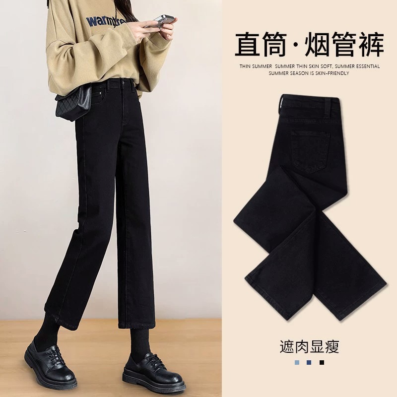 タバコのズボンの女性2025の新型の秋冬のベルベットは厚い腰の狭い版の9分の小さい背の黒色のまっすぐなジーパンをプラスします。