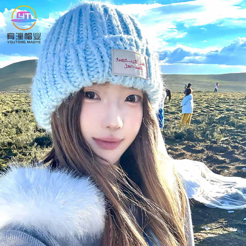 大头围贴布蓝色粗针毛线帽女2025年秋冬季显脸小百搭帽子护耳冷帽