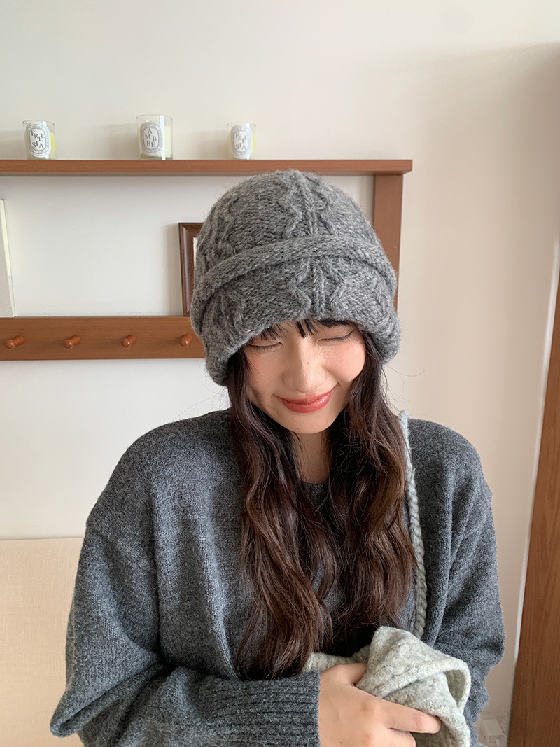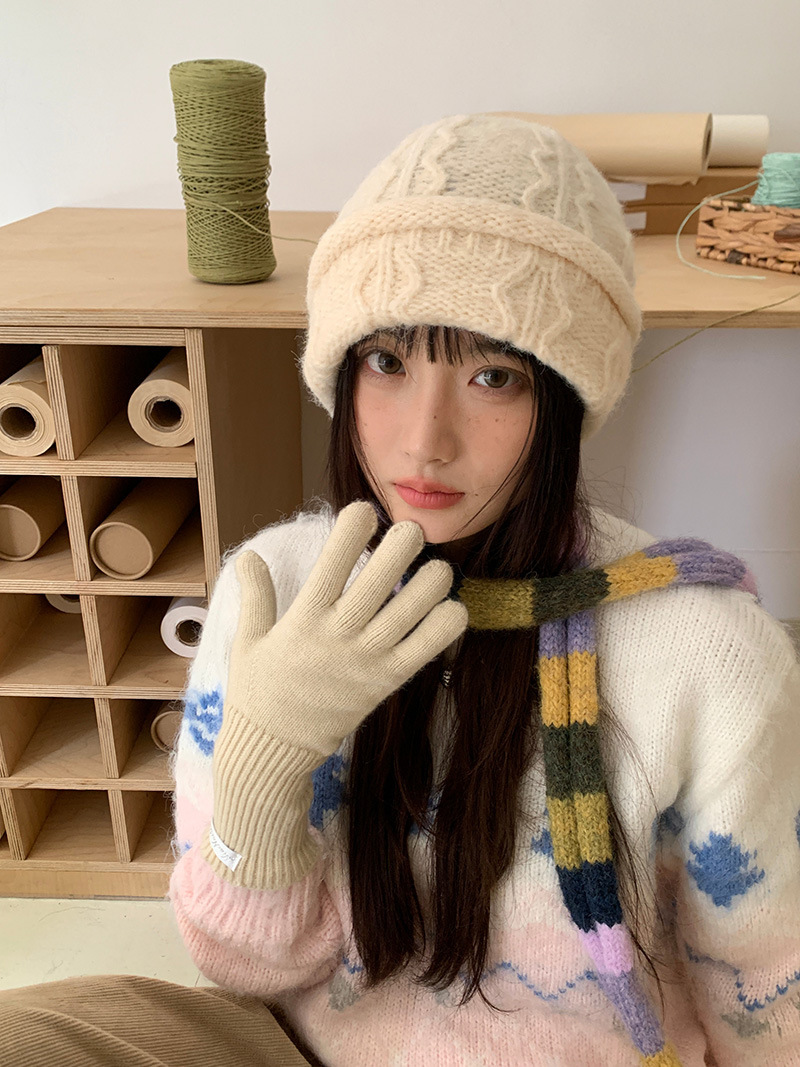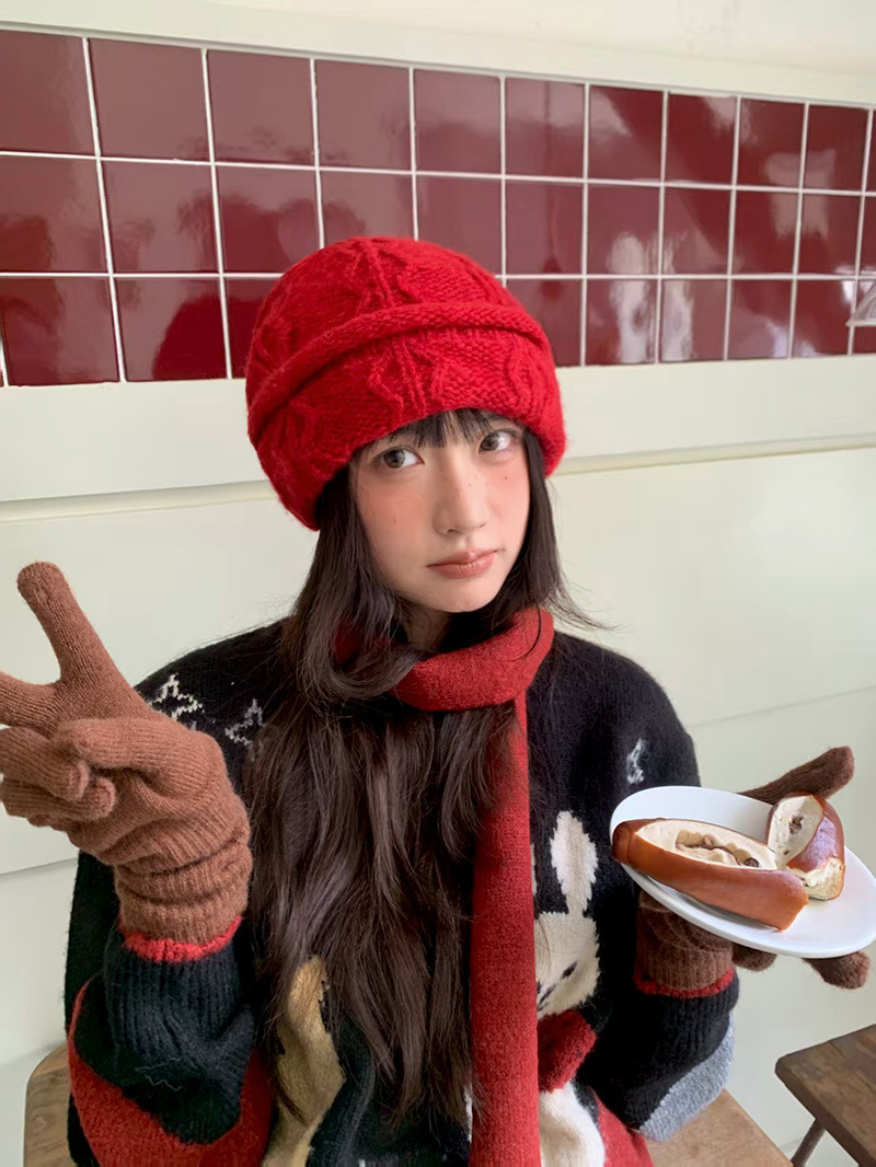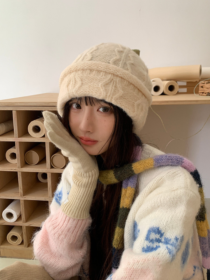 女秋冬保暖显脸小复古氛围感毛线帽冷帽费尔岛卷边提花针织堆堆帽