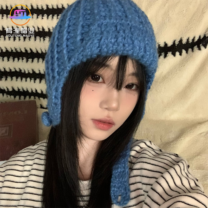 手工编织蓝色粗毛线帽绑带雷锋帽女秋冬保暖百搭显脸小护耳飞行帽