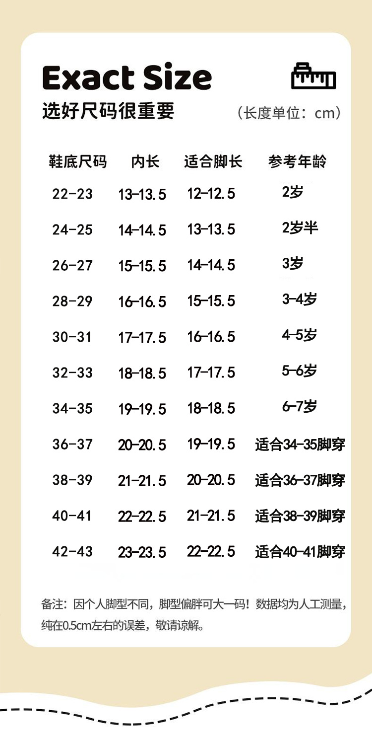 尺码 22-23码内长13-13.5厘米,24-25码内长14-14.5厘米,26-27码内长15-15.5厘米,28-29码内长16-16.5厘米,30-31码内长17-17.5厘米,32-33码内长18-18.5厘米,34-35码内长19-19.5厘米,36-37码内长20-20.5厘米,38-39码内长21-21.5厘米,40-41码内长22-22.5厘米,42-43码内长23-23.5厘米