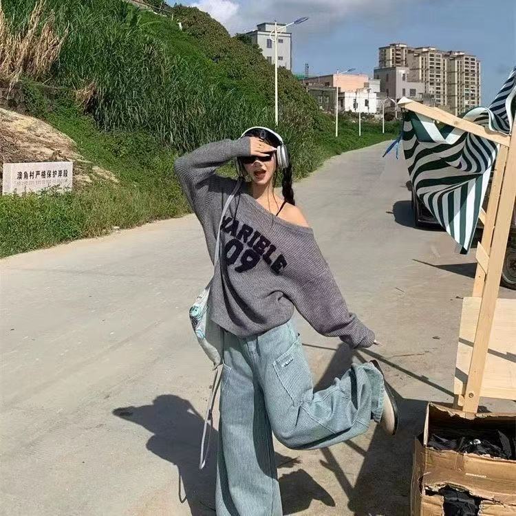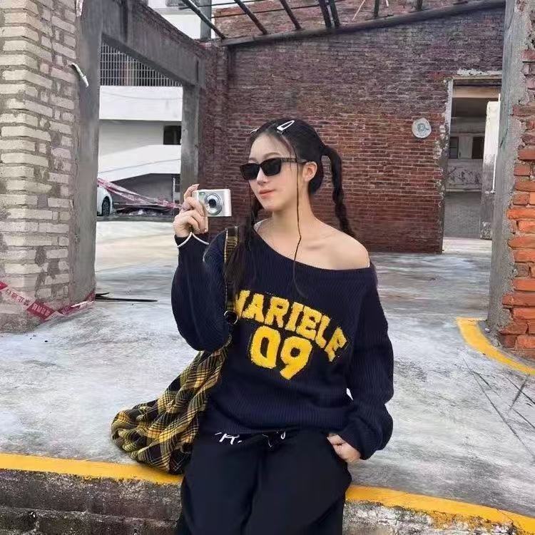 美式慵懒复古斜肩辣妹字母卫衣针织衫女秋冬新款宽松设计毛衣女潮