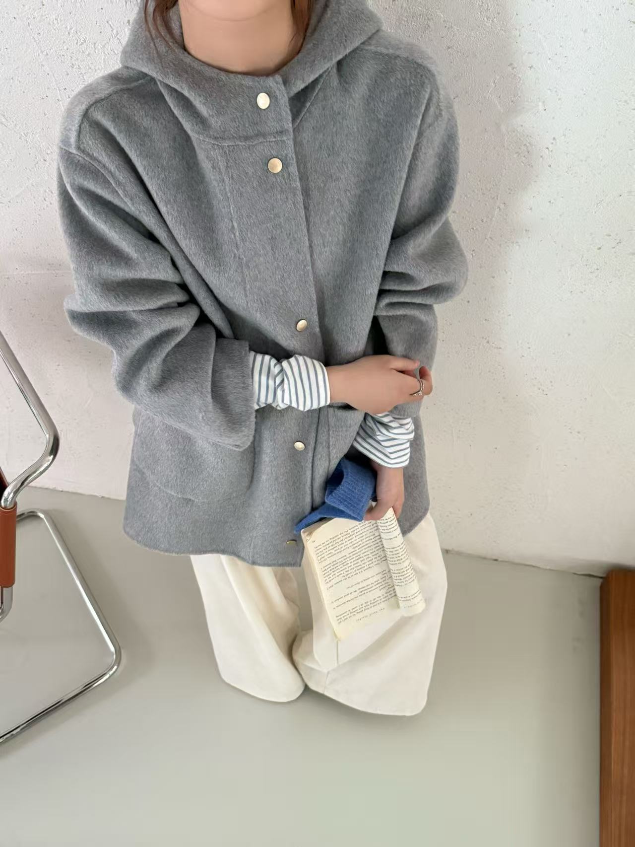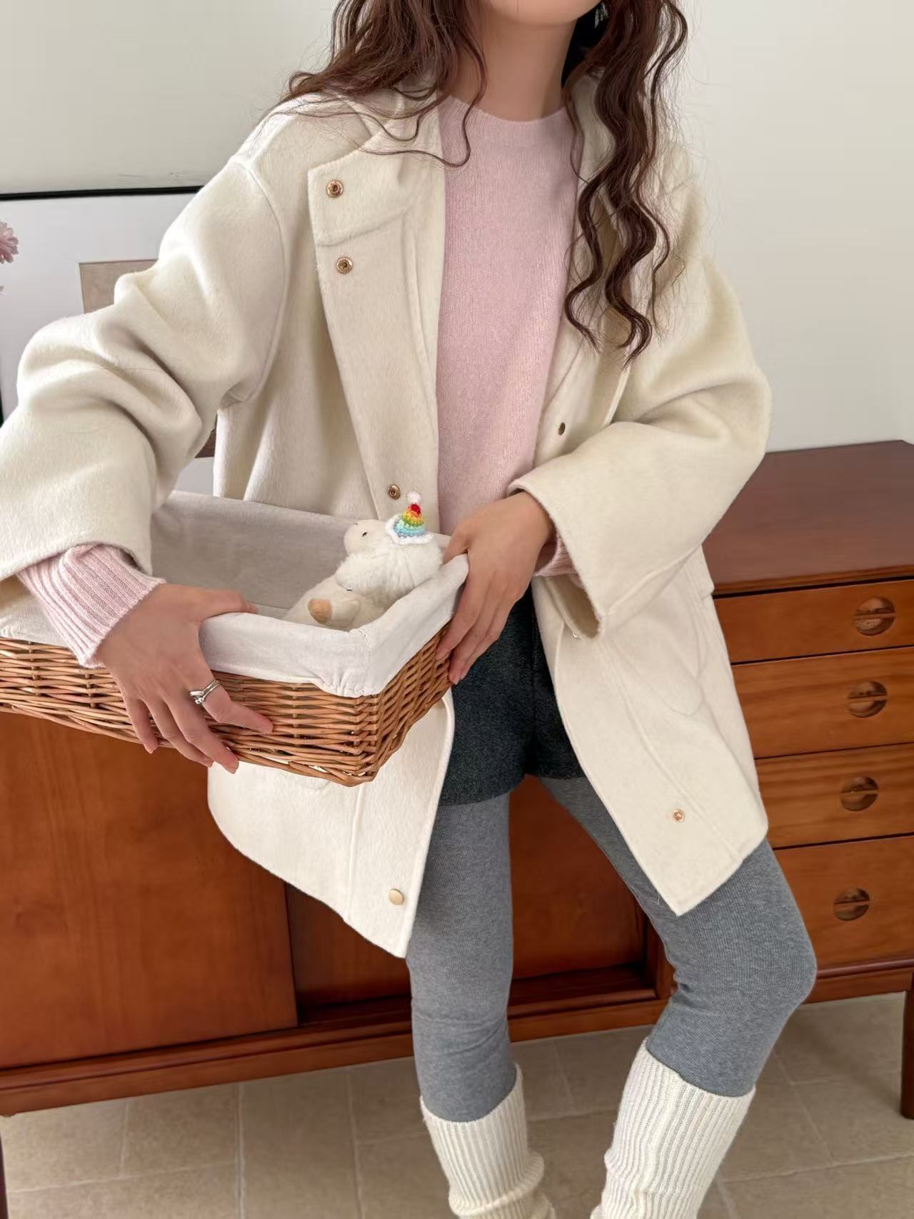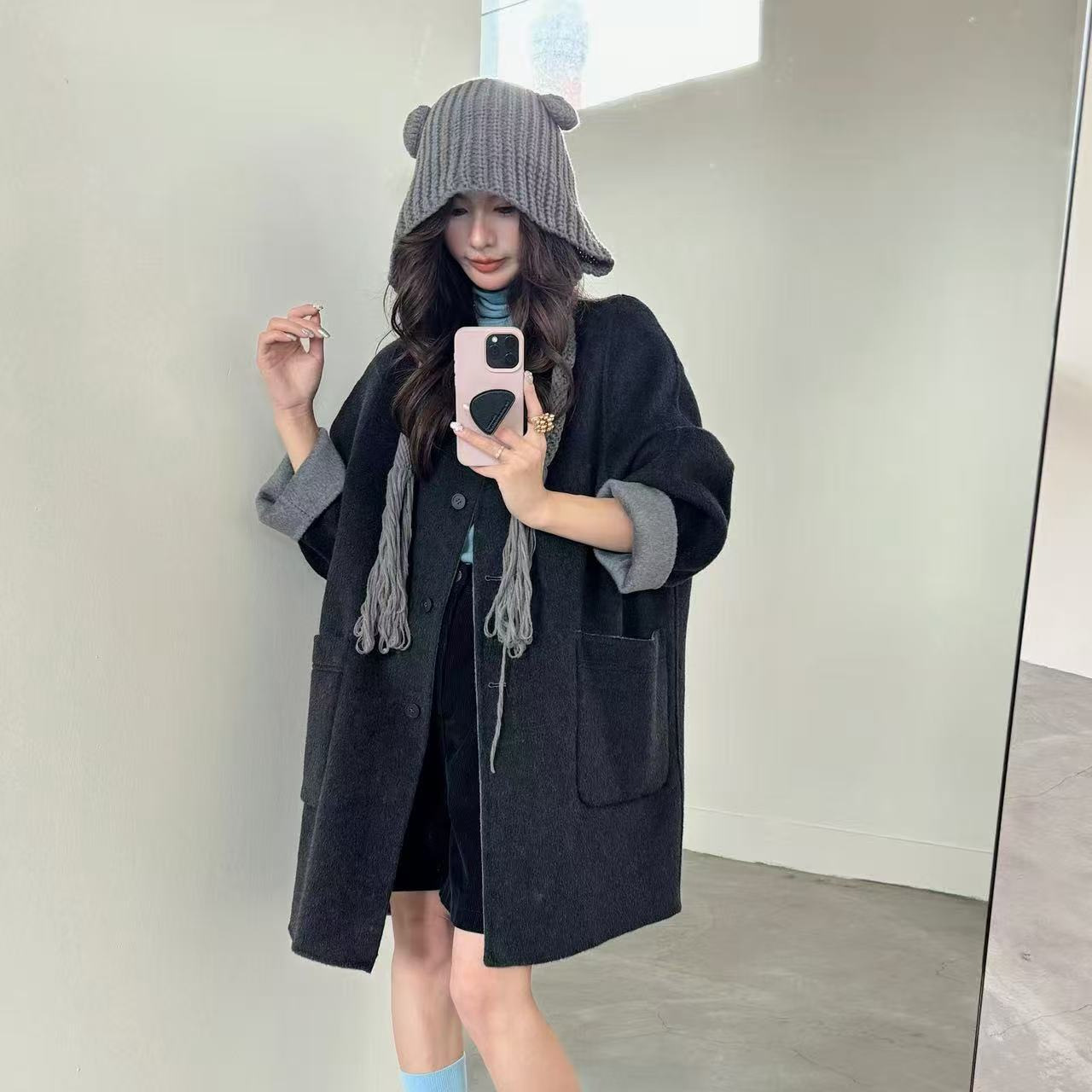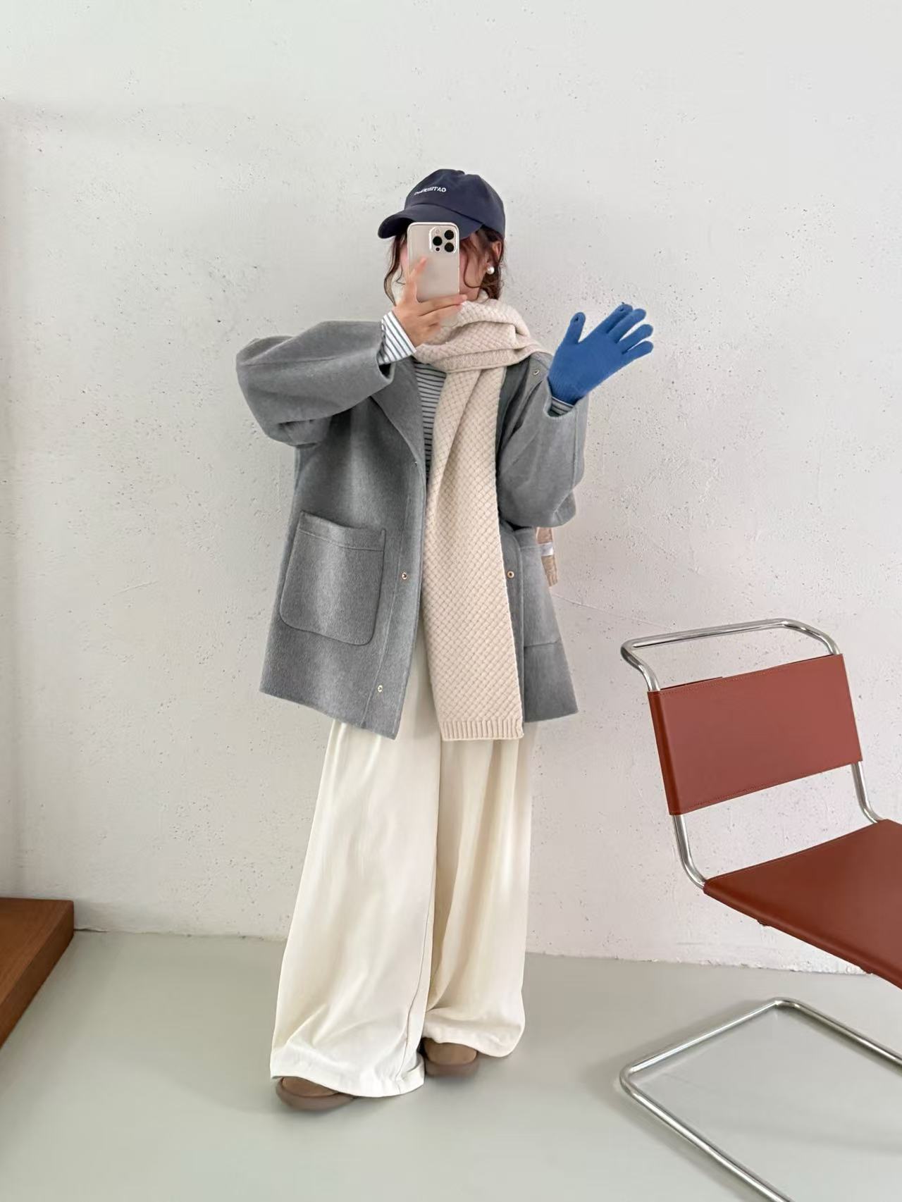 小熊针织帽子韩国东大门新款圆领灰色双面手工羊毛大衣女减龄廓形