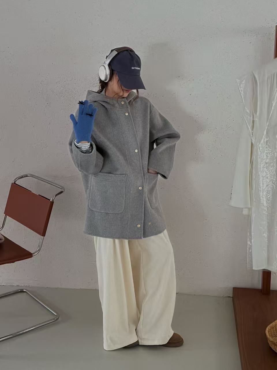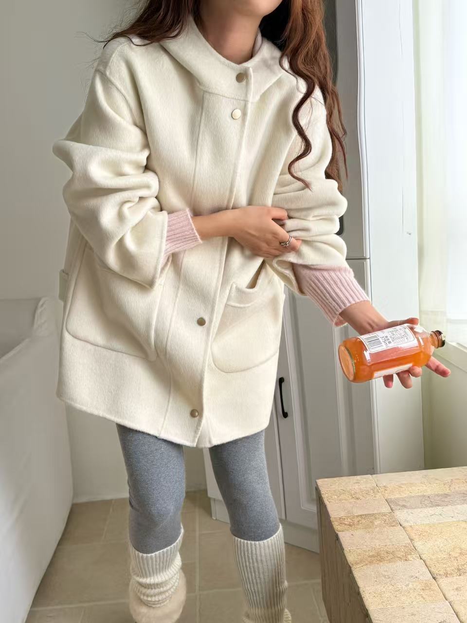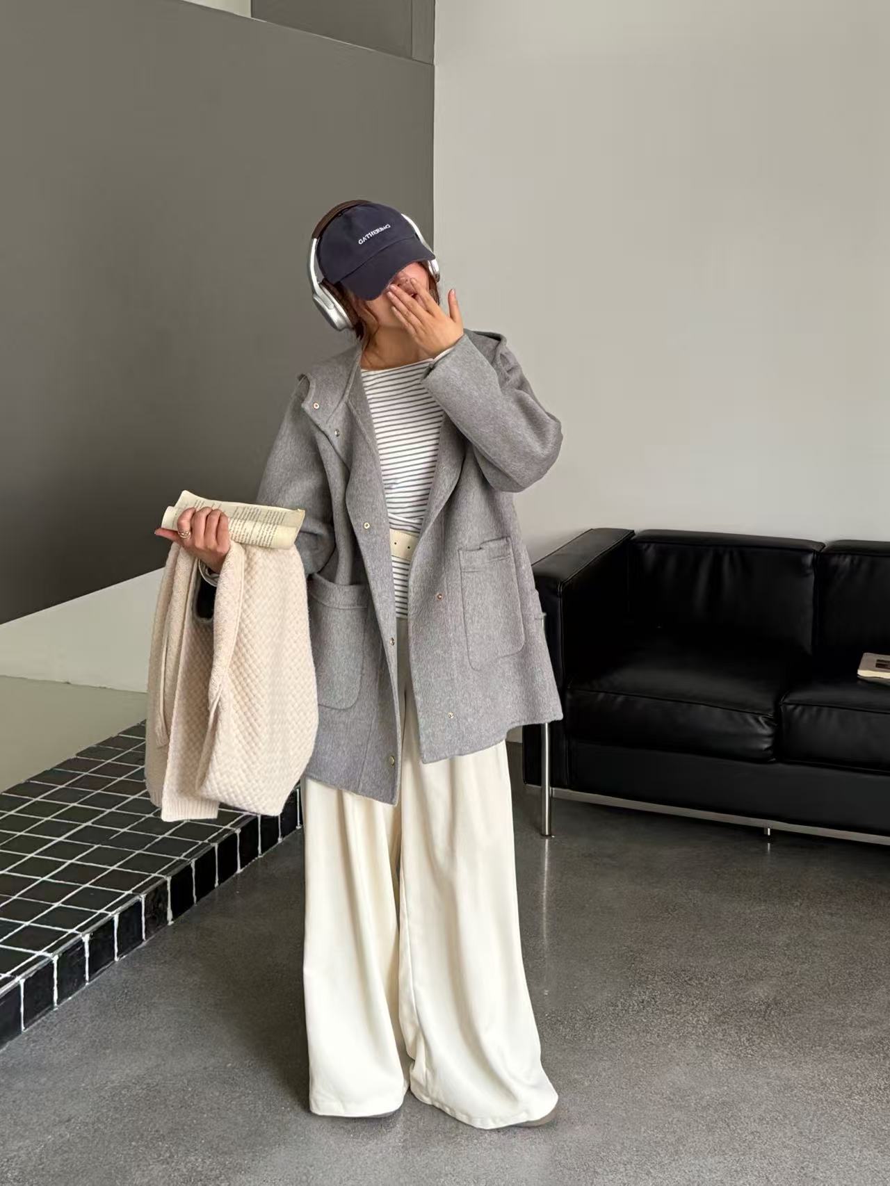 小熊针织帽子韩国东大门新款圆领灰色双面手工羊毛大衣女减龄廓形