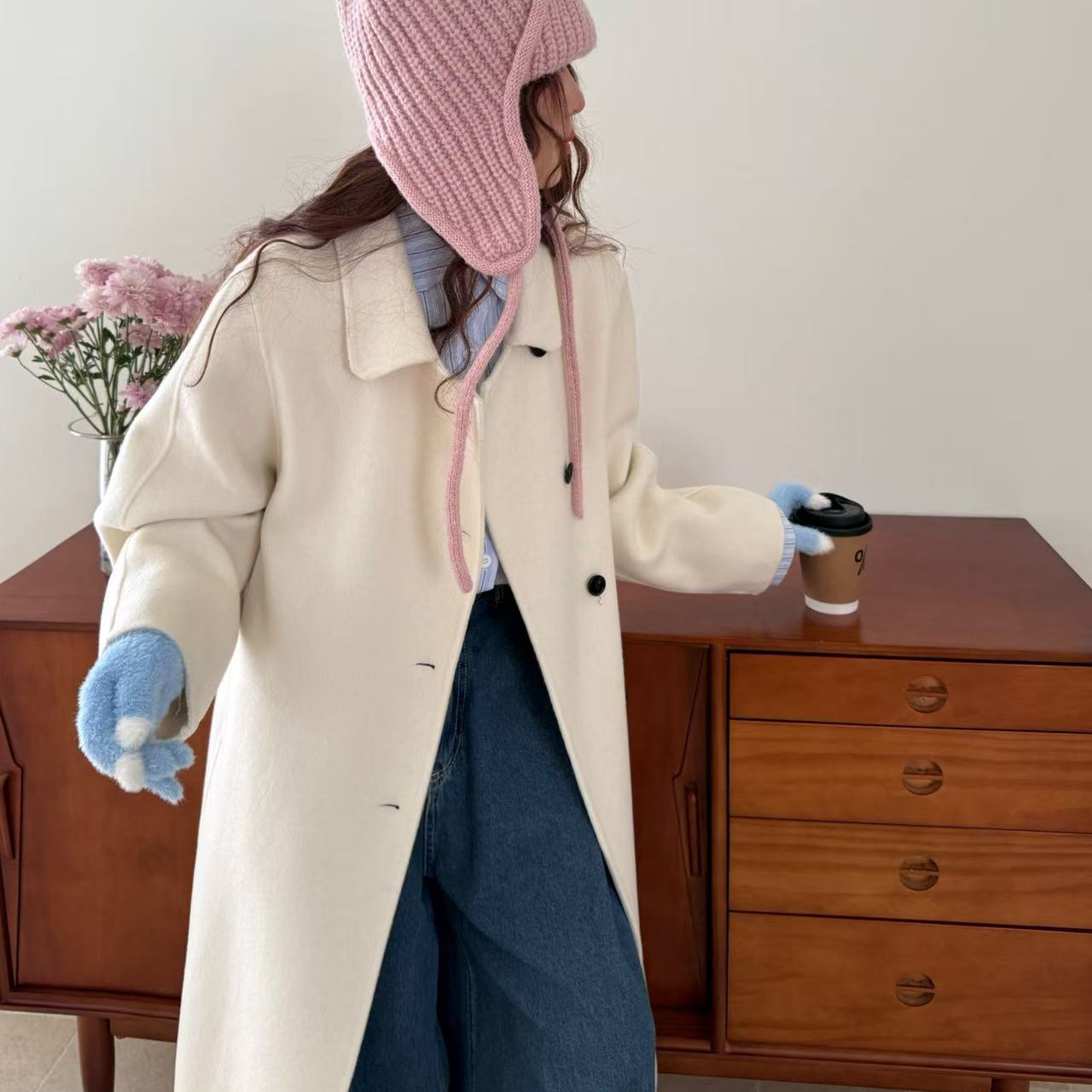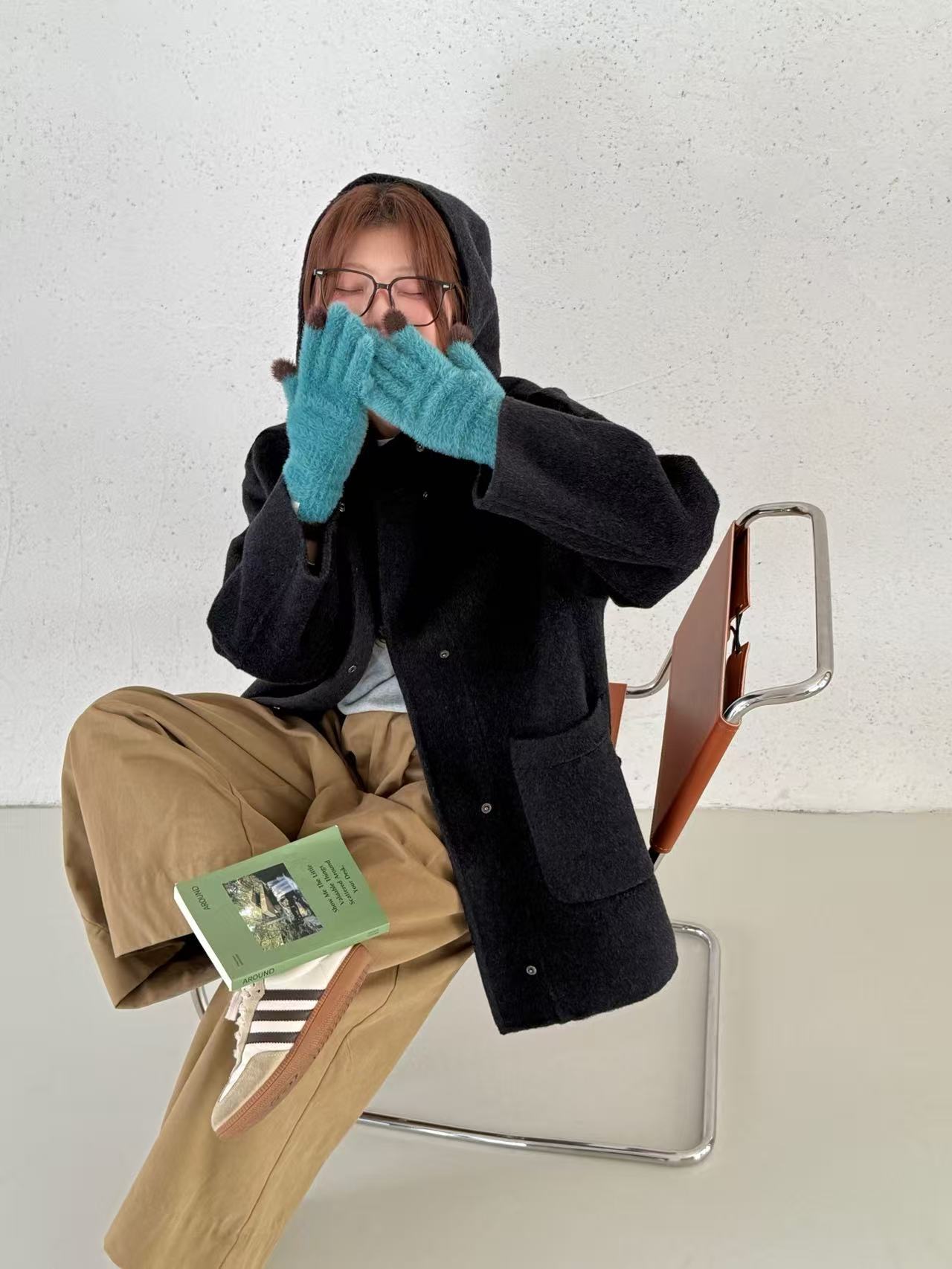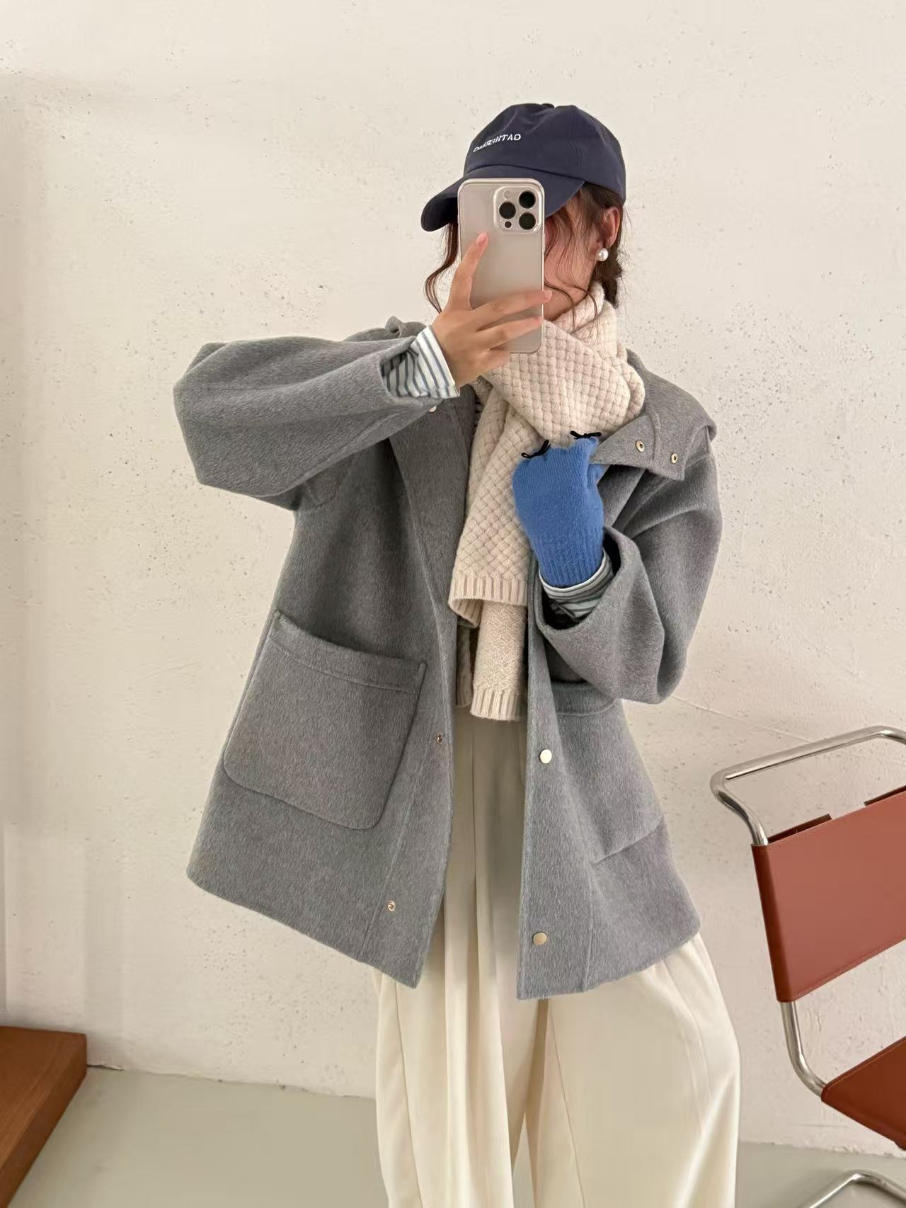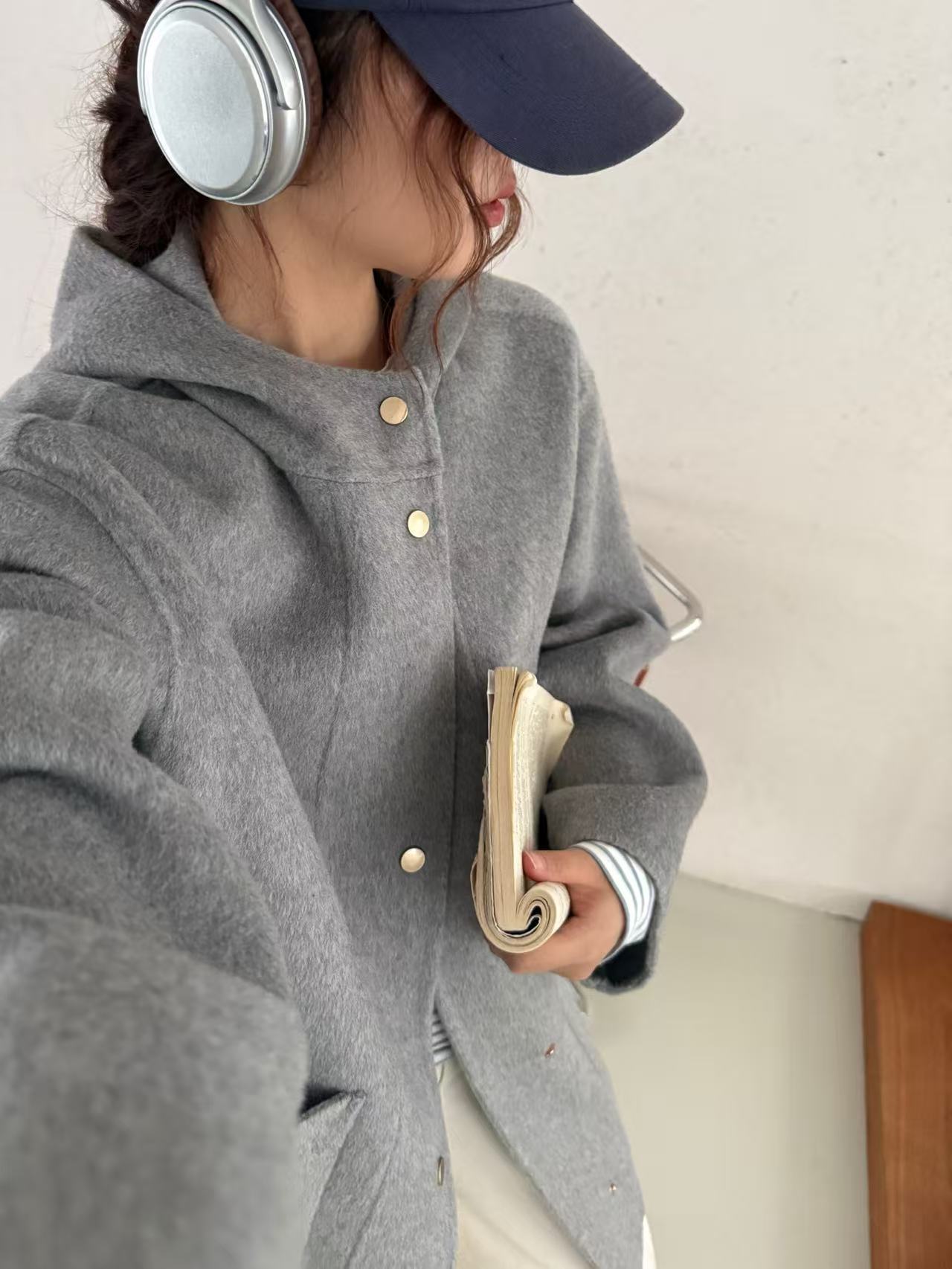 小熊针织帽子韩国东大门新款圆领灰色双面手工羊毛大衣女减龄廓形
