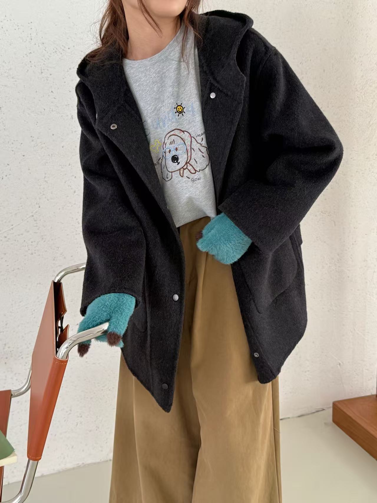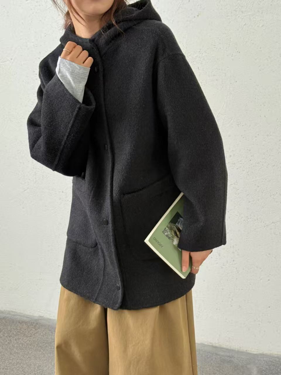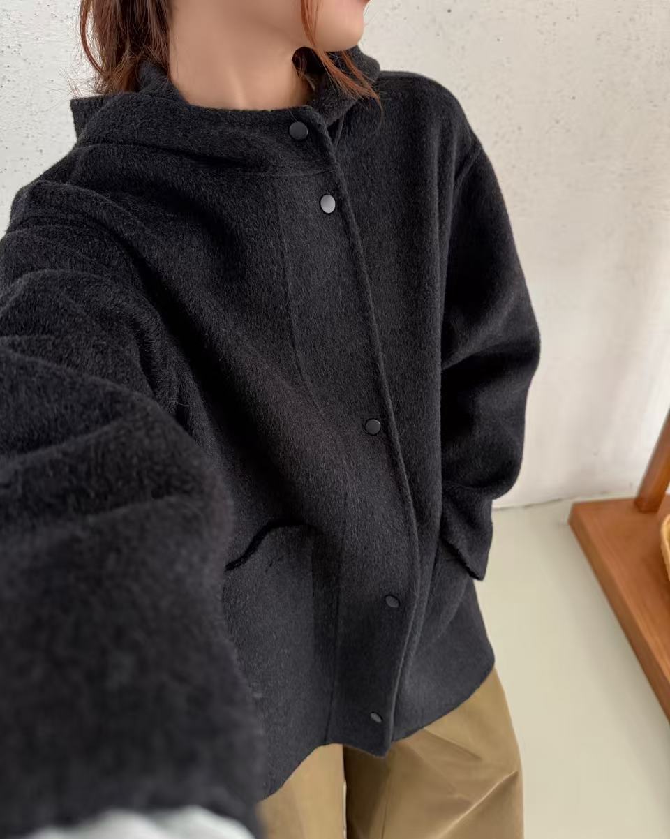 2025秋冬季新款羊绒连帽短款手工双面羊毛大衣韩版宽松毛呢外套女