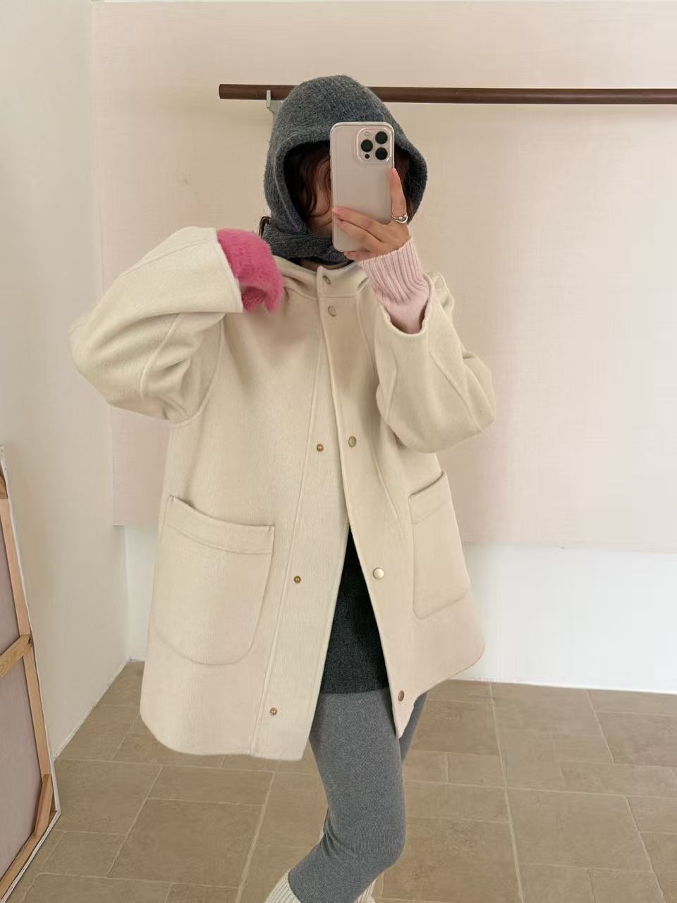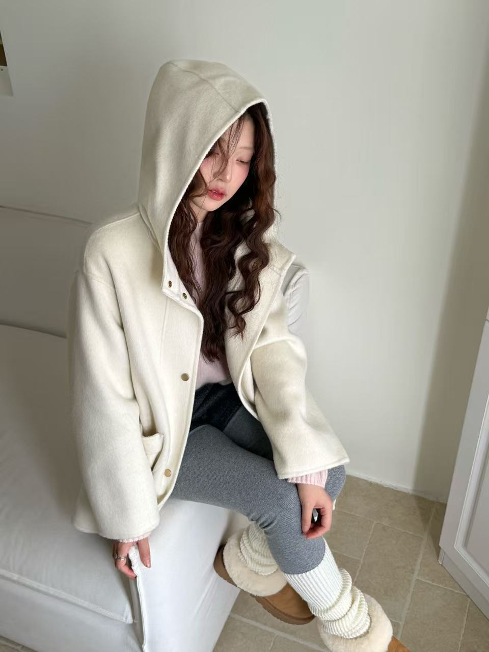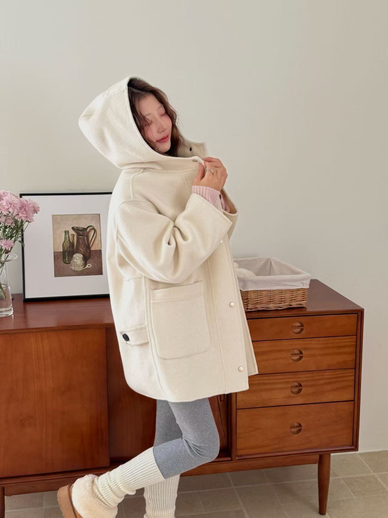 2025秋冬季新款羊绒连帽短款手工双面羊毛大衣韩版宽松毛呢外套女
