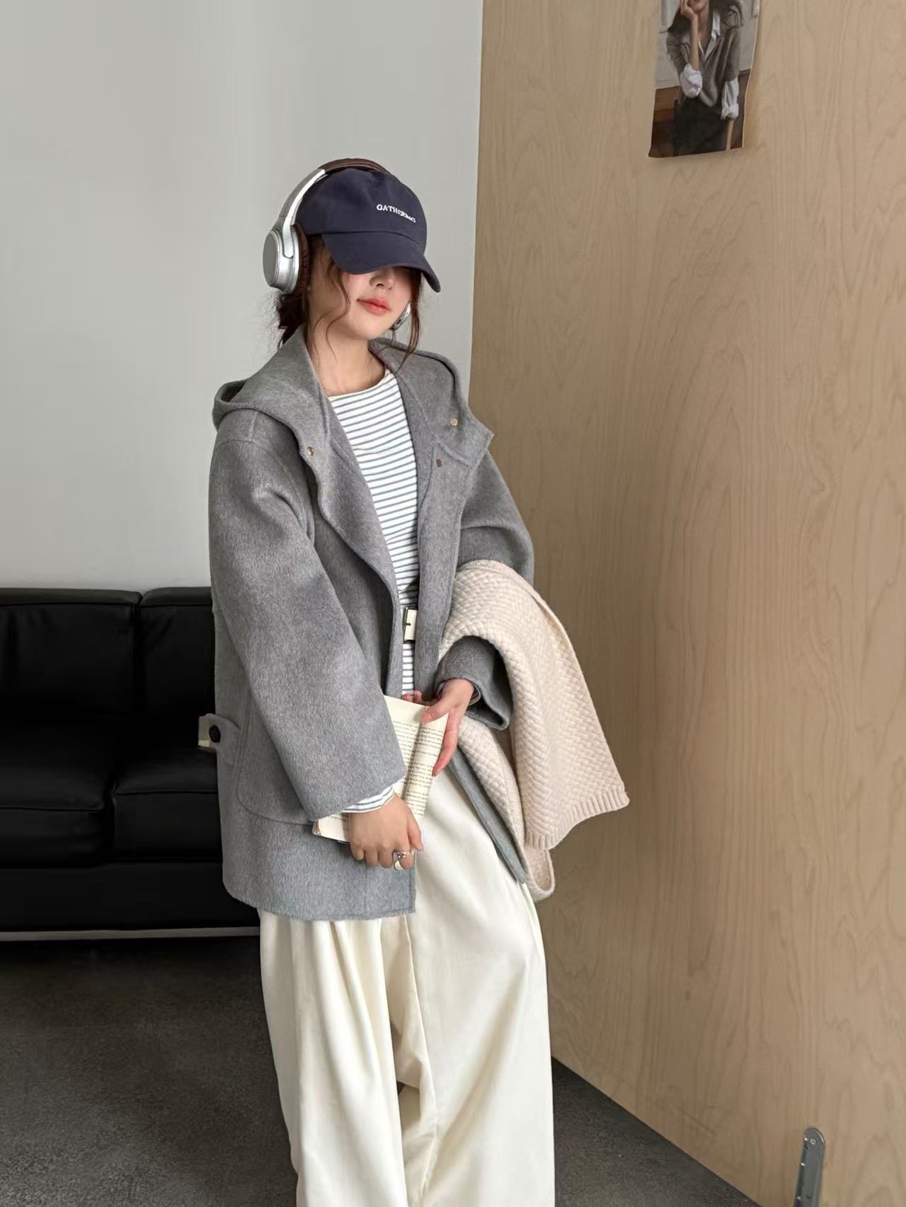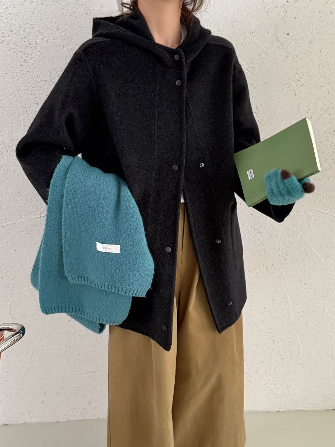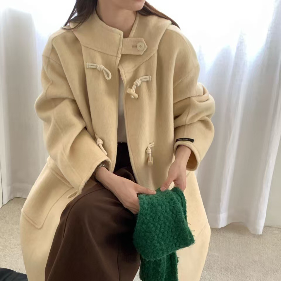 2025新款韩系气质双面羊毛大衣宽松秋冬牛角扣帽子长款毛呢外套女