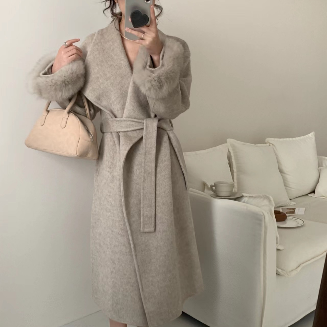 バスローブ式の大きな襟は両面のウールコートを着ています。