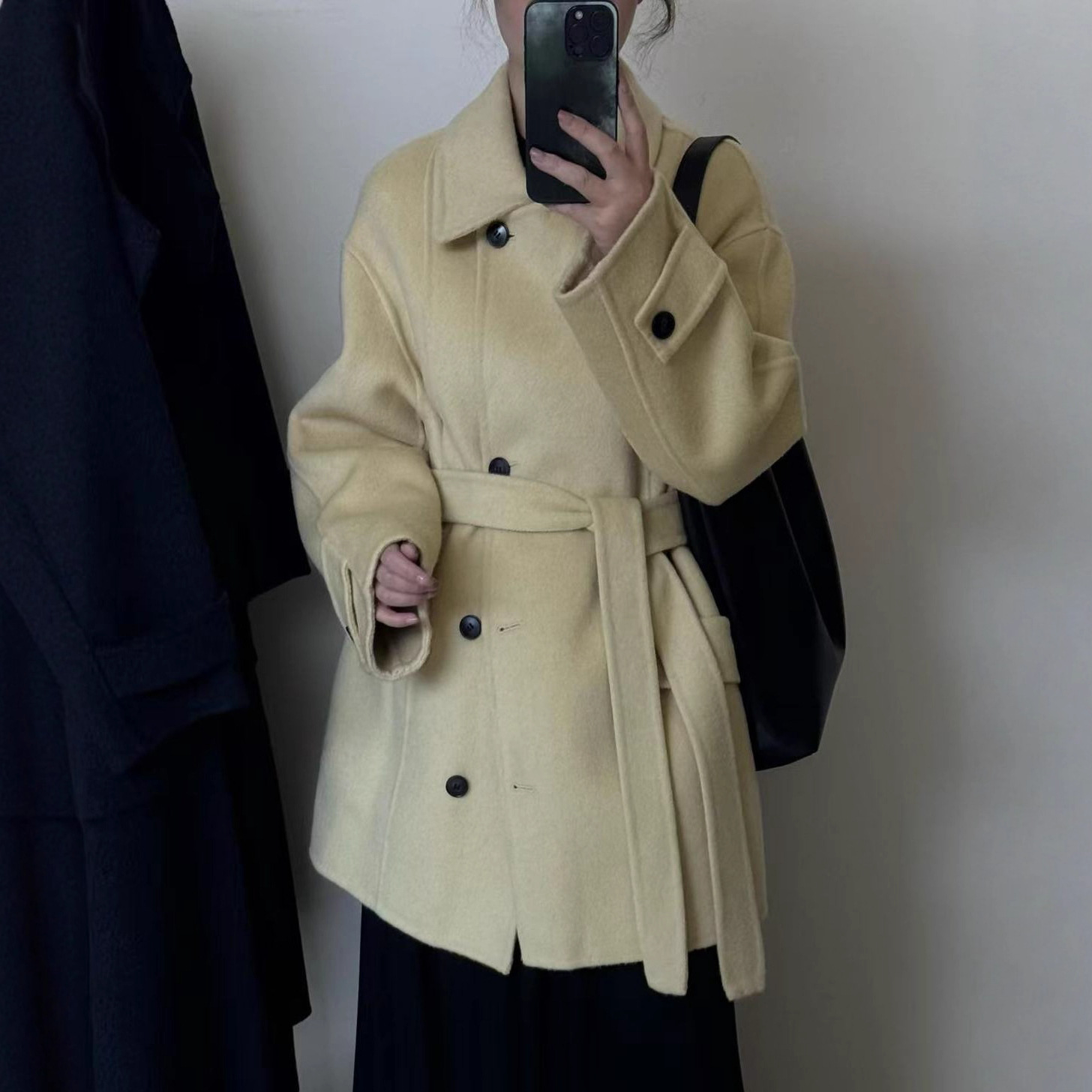 韩系翻领单排扣直筒复古宽松腰带中长款双面羊绒大衣女毛呢外套冬