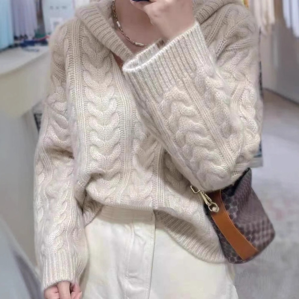 麻花连帽套头纯羊毛毛衣女秋冬复古慵懒宽松加厚百搭外穿针织上衣
