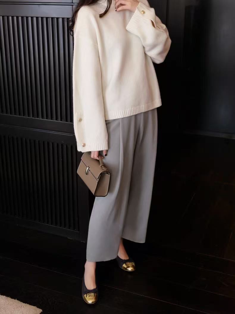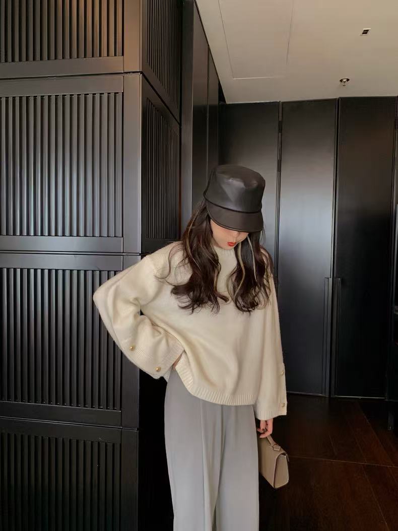 慵懒风100%羊毛衫女秋冬斜扣麻花高领针织衫毛衣宽松显瘦打底上衣