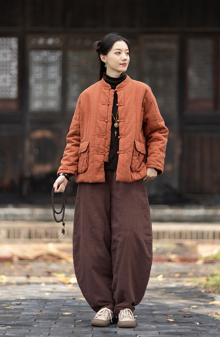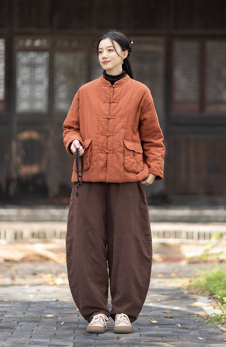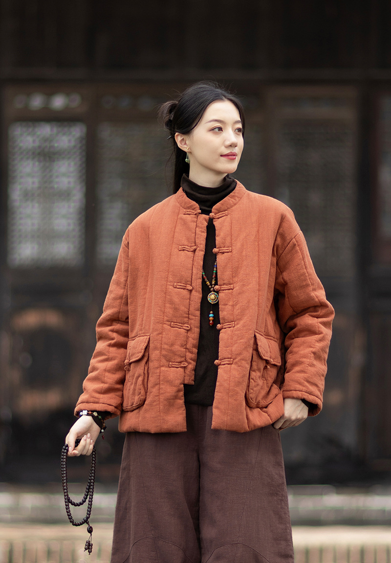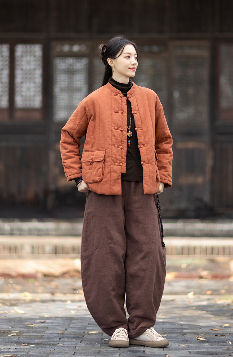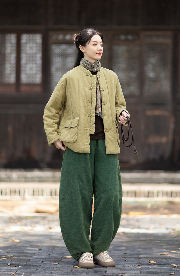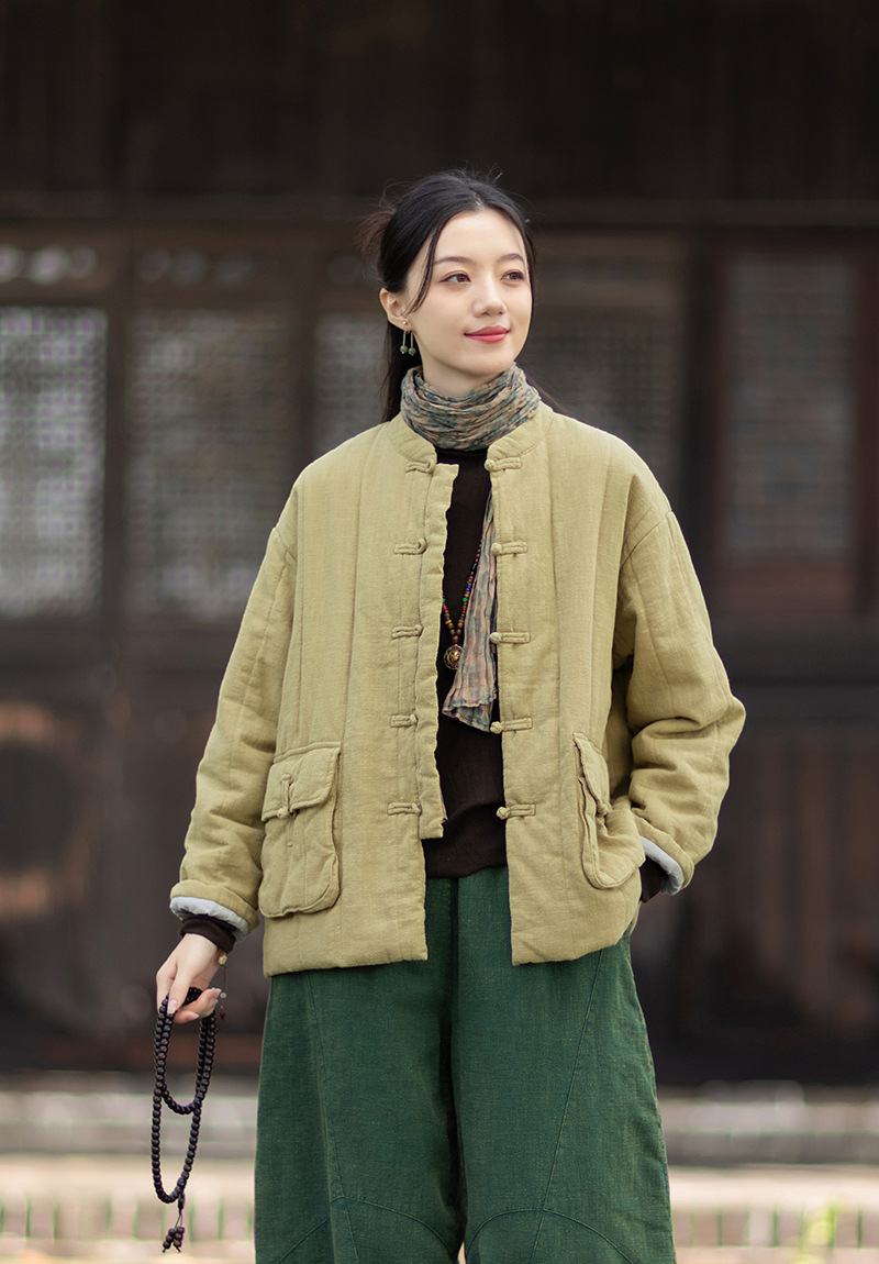 2025年冬新作 綿麻婦人服 新麻綿砂洗い加工 シンプル禅風 中綿入り厚手 女性用盤扣綿服