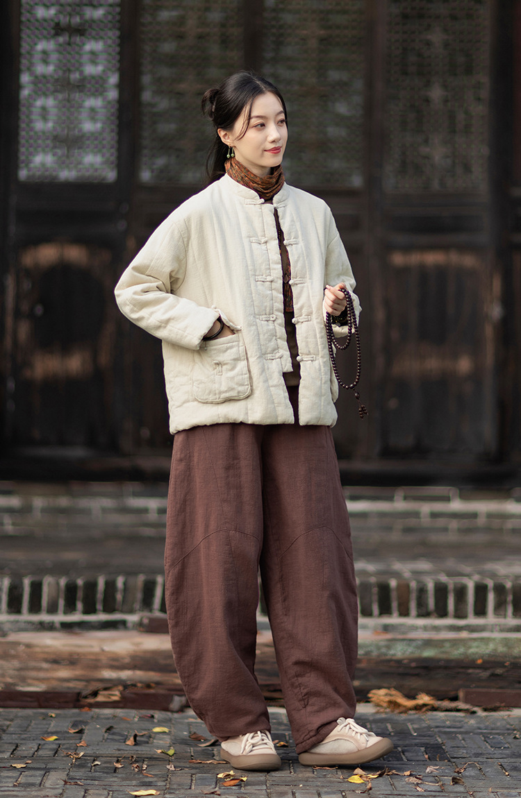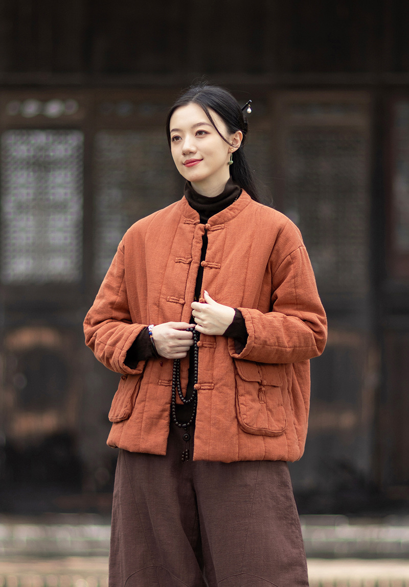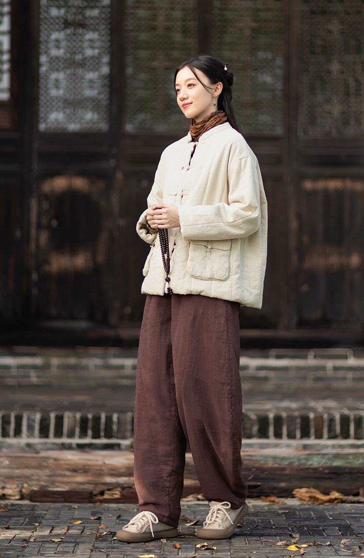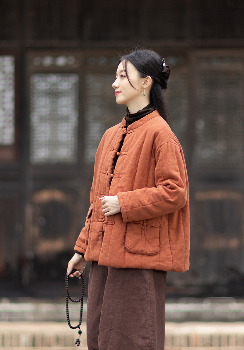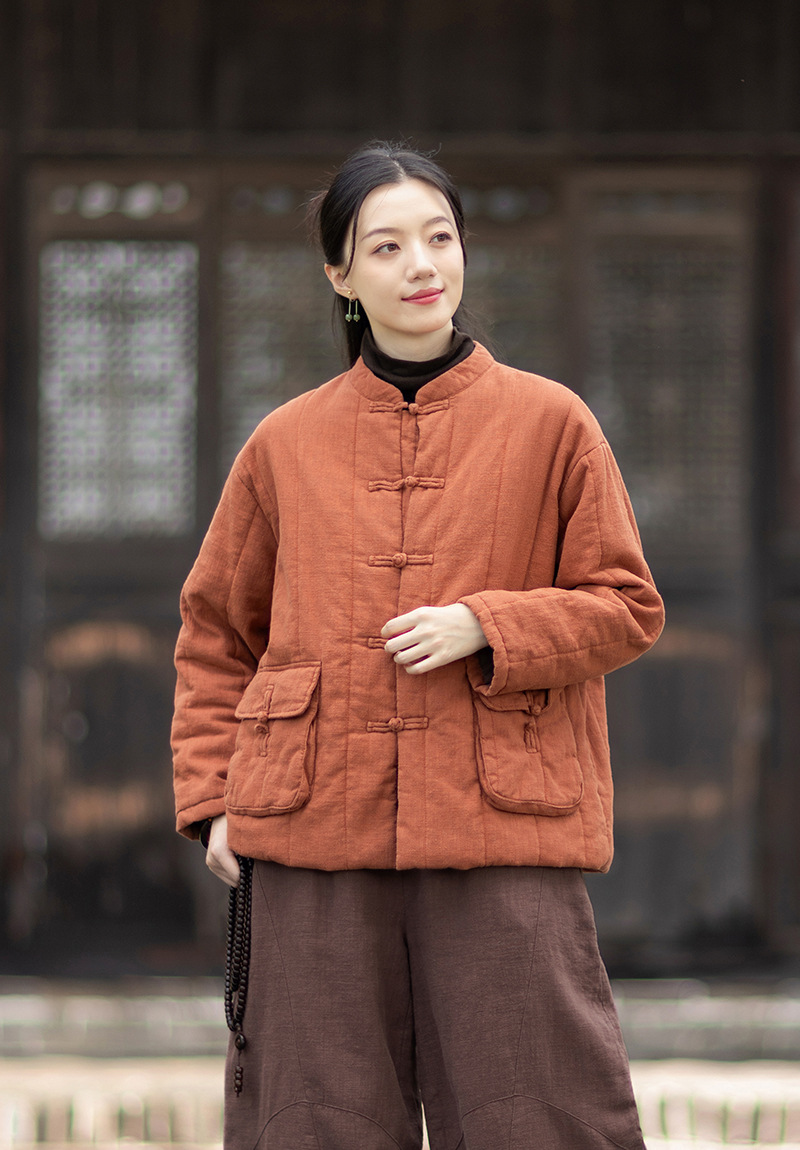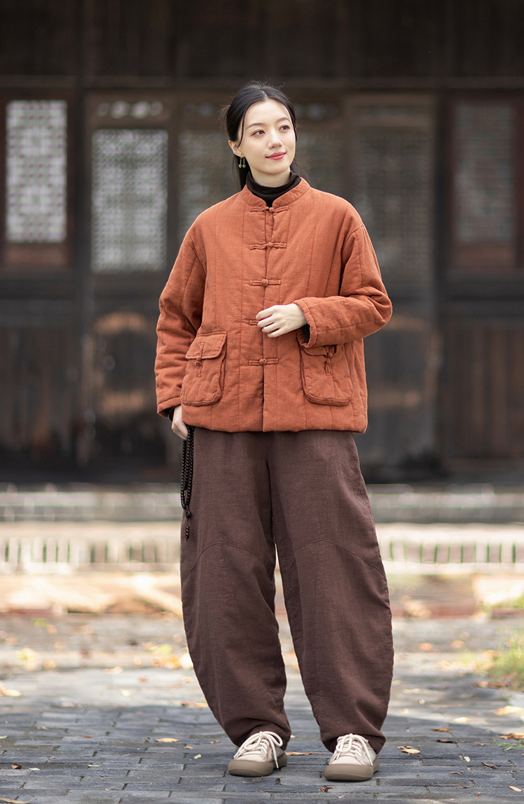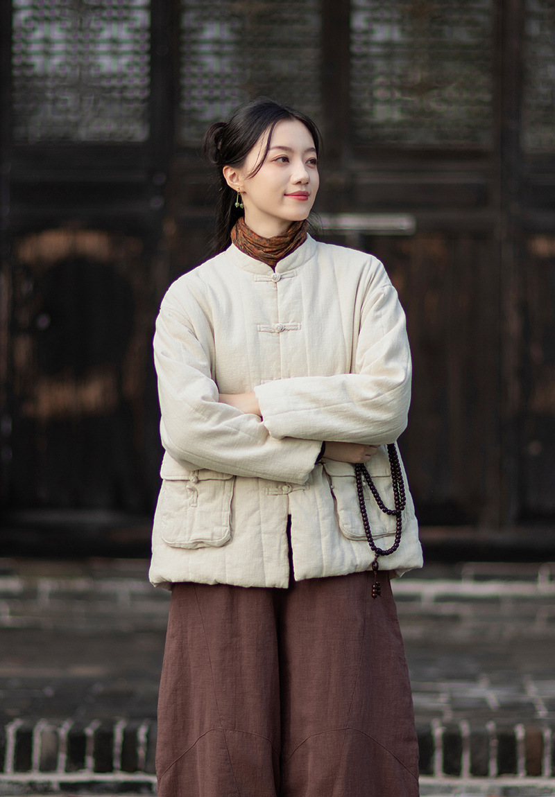 2025年冬新作 綿麻婦人服 新麻綿砂洗い加工 シンプル禅風 中綿入り厚手 女性用盤扣綿服