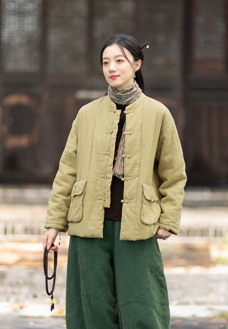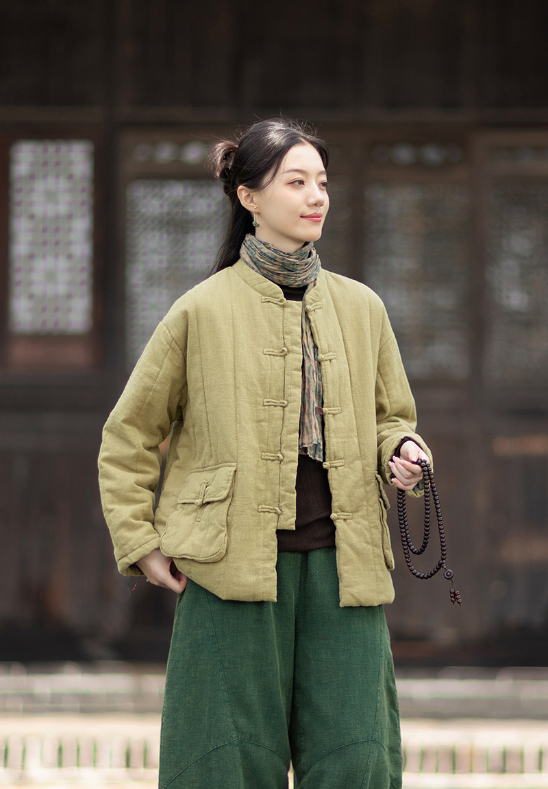25冬の新スタイルの綿と麻の婦人服中国風のレトロなスタンドカラーボタンダウン綿ジャケット女性のキルティング厚みのある禅ラミー綿コート