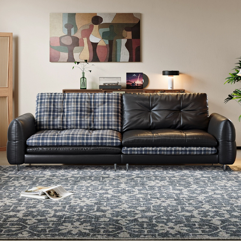 两面用真皮沙发小户型皮布结合拆洗汉堡沙发羽绒中古风油蜡皮沙发