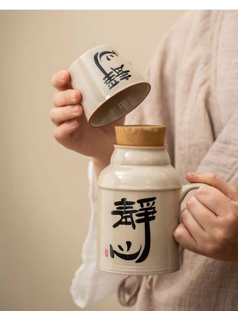 汝窯小暖壺マグカップ蓋付き陶磁器蒸し器カップ中国式大容量保温瓶事務カップハンドル付き