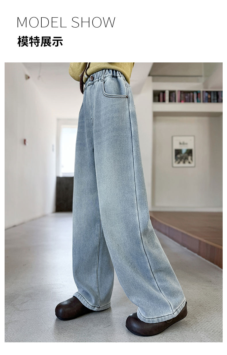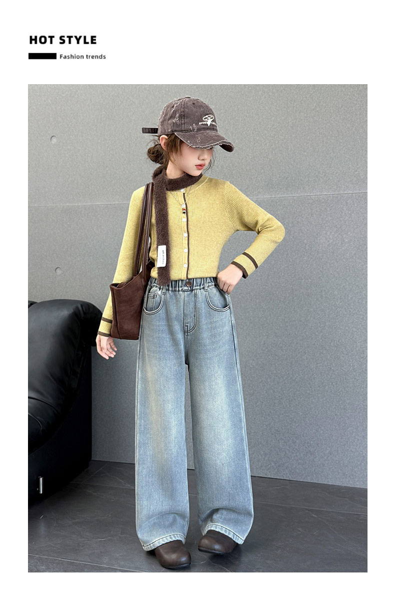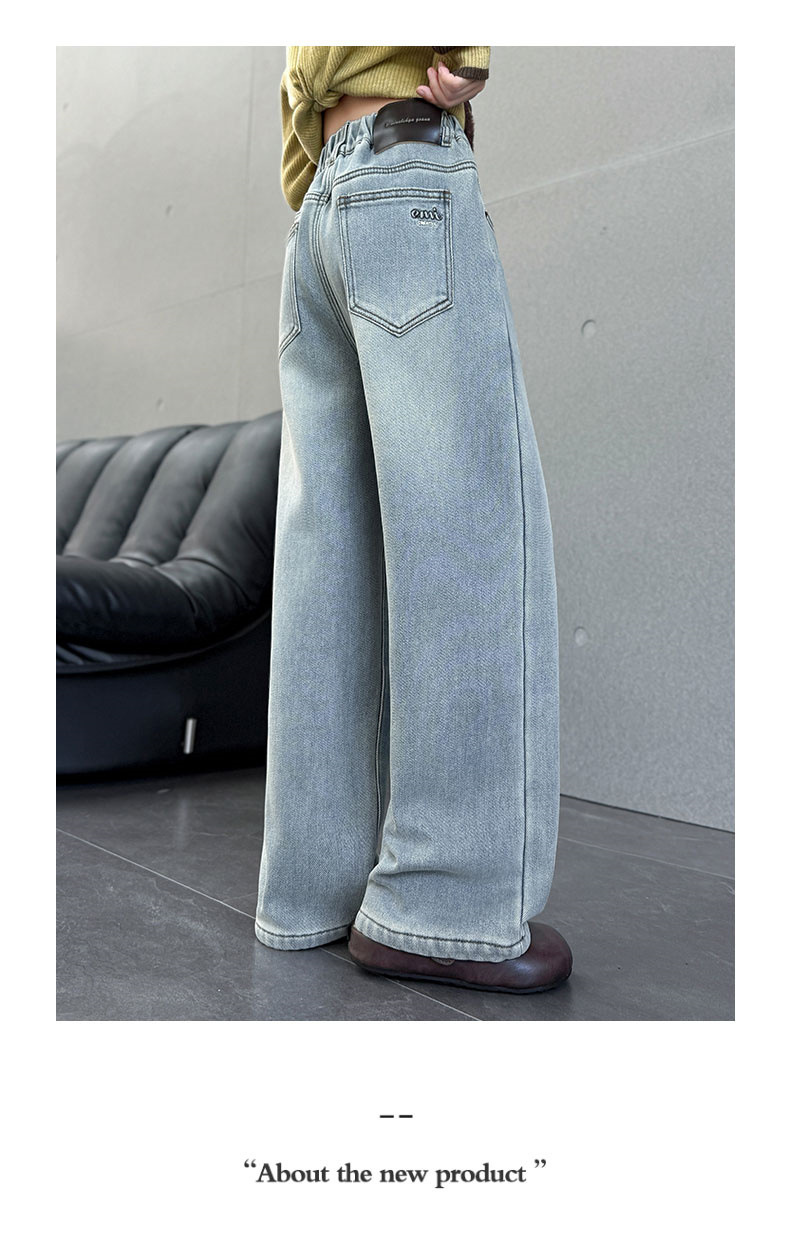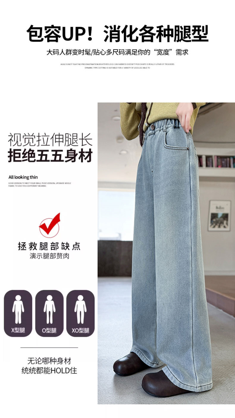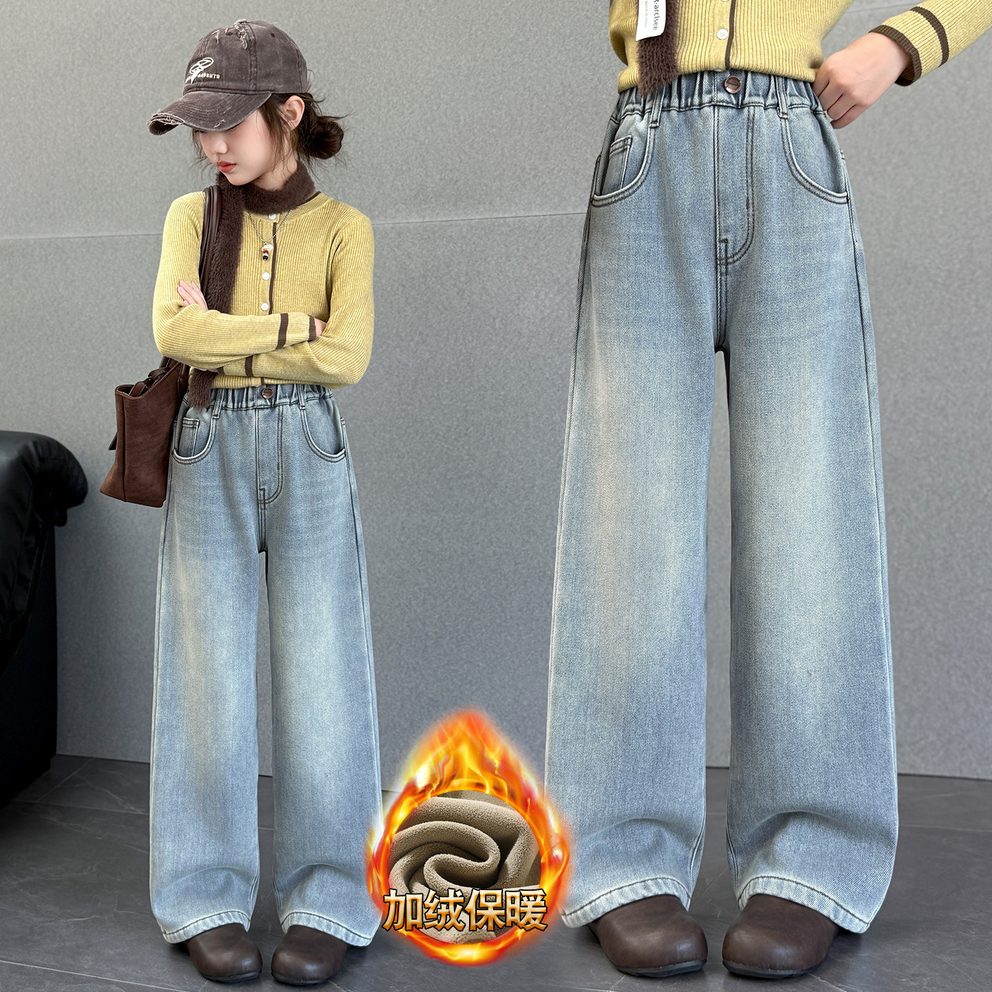 女童裤子冬装2025款儿童牛仔裤初中生女孩大童加绒加厚直筒阔腿裤